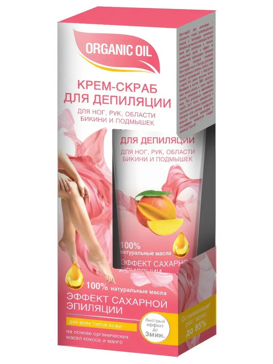 Крем-скраб Fito Косметик Organic oil для депиляции, для ног, рук, области бикини и подмышек, 100 мл. Крем-скраб для депиляции абсолютно новый революционный подход к процедуре депиляции! Впервые депилятор совмещает в себе крем для депиляции и нежный, деликатный скраб, а эффект от применения превосходит салонную процедуру сахарной эпиляции. Крем -скраб легко и быстро устраняет нежелательные волосы, делает кожу нежной, шелковистой и безупречно гладкой без риска вросших волос. Входящие в состав 100% органические масла кокоса и манго глубоко питают, увлажняют и омолаживают кожу. При регулярном применении скраба рост волос замедляется и постепенно полностью прекращается. Подарите себе роскошь профессиональной салонной процедуры и наслаждение невероятно гладкой кожей до 15 дней! Состав: Состав: Aqua, Cetearyl Alcohol, Ceteareth-23, Calcium Thioglycolate, Argania Spinosa Kernel Oil (масло арагны), Butyrospermum Parkii Butter (масло ши), Potassium Hydroxide, Aloe Barbadensis Leaf Extract (экстракт алоэ), Panthenol (пантенол), Tocopheryl Acetate (витамин Е), Phenoxyethanol, Parfum. Способ применения: Способ применения: Нанесите крем на кожу сплошным равномерным слоем так, чтобы все волоски были полностью покрыты. Оставьте крем на 3-5 мин, затем слегка помассируйте и смойте водой или удалите его вместе с волосками лопаточкой, а затем тщательно ополосните кожу водой. При необходимости, увеличьте время воздействия крема. Общее время воздействия не должно превышать 15 минут.