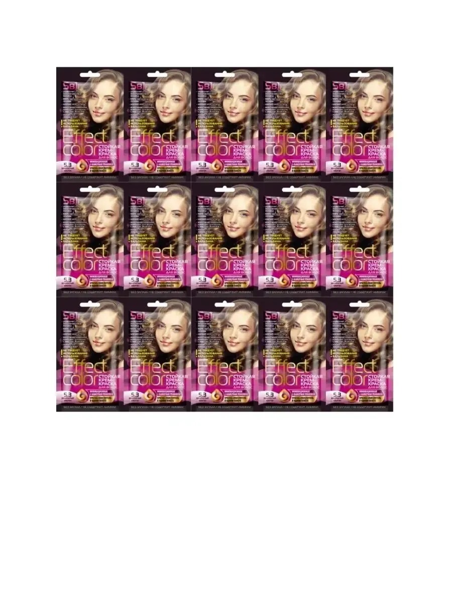 Effect Color Cream Hair Dye, Shade 5.3 Golden Chestnut. 15 50ml bottles included. The innovative two-chamber packaging contains the dye and developer emulsion in one package. This long-lasting cream hair dye, Effect Color (mocha color), envelops each strand, penetrating deep into its structure and delivering a rich, voluminous, and saturated color. This cream hair dye perfectly covers gray hair! The light, creamy texture is easy to apply and does not run. A restorative complex with jojoba oil intensively cares for hair during the coloring process: it nourishes, restores, and adds smoothness, elasticity, and volume.
