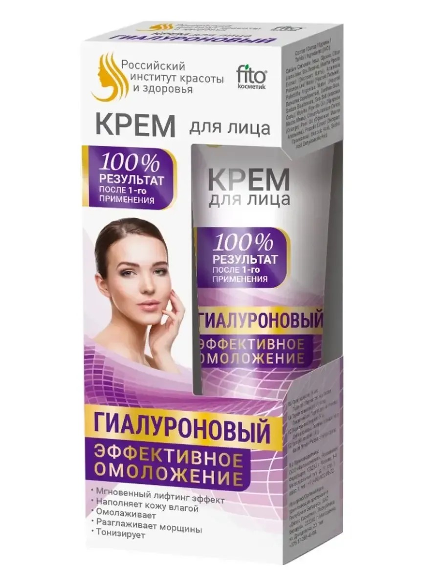 Fito косметик Крем для лица Гиалуроновый Эффективное омоложение, 45 мл 1 шт. Крем для лица гиалуроновый увлажняющий fito косметик. Увлажняющий крем предназначен для бережного антивозрастного ухода, интенсивного увлажнения и защиты дермы от негативного воздействия окружающей среды. Крем белого цвета, мягкой консистенции, с легким приятным ароматом. Гиалуроновый крем для лица равномерно распределяется, мгновенно впитывается, не оставляя на лице эффекта пленки, жирности. В составе увлажняющего крема для лица - высокая концентрация низкомоллекулярной гиалуроновой кислоты, природные компоненты, экстракт женьшеня, клюквы, масло рисовых отрубей, макадамии. Крем подходит для ежедневного применения как основа под макияж, для любого типа кожи, не вызывает аллергических реакций. При регулярном применении увлажняющего крема кожа становится гладкой, увлажненной, эластичной, выравнивается тон кожи, сокращаются морщинки, возвращается мягкость и здоровое сияние.