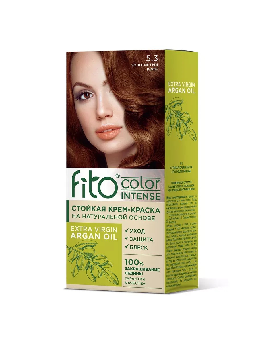 Fitoкосметик Крем-краска для волос Fito Color Intense, тон 5.3 Золотистый кофе, 115 мл. Стойкая крем-краска для волос Fito Color Intense содержит 90% ингредиентов натурального происхождения и самые современные стойкие пигменты, которые надежно закрашивают седину, обеспечивают стойкое окрашивание и естественный многогранный цвет. Крем-краска ухаживает за волосами во время окрашивания, цветочный воск придает волосам в три раза больше блеска, глазирует поверхность волос, делает их мягкими и послушными. Результат: 100% закрашивание седины, яркий цвет и невероятный блеск.