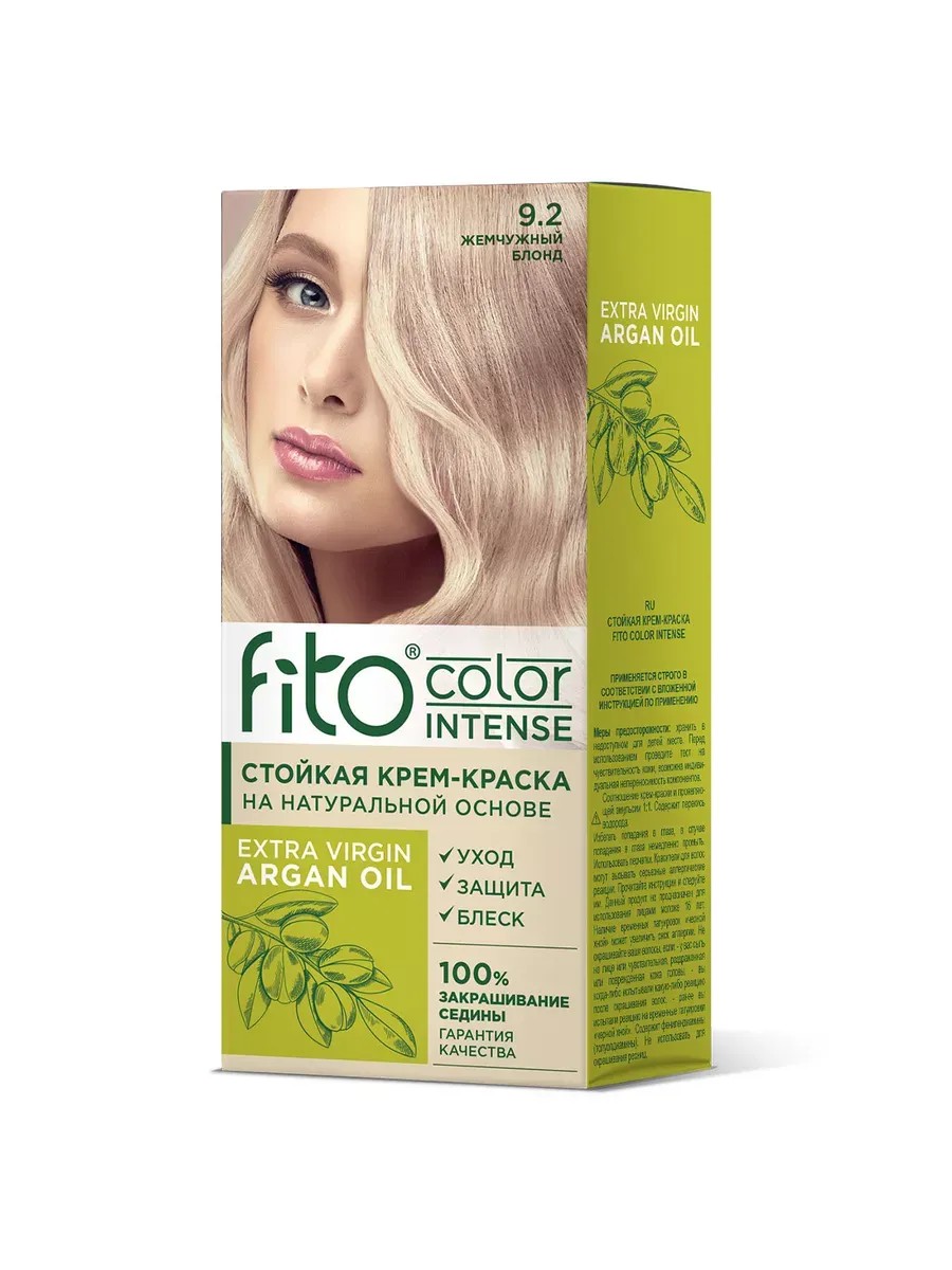 Fitoкосметик Крем-краска для волос Fito Color Intense, тон 9.2 Жемчужный блонд, 115 мл. Стойкая крем-краска для волос Fito Color Intense содержит 90% ингредиентов натурального происхождения и самые современные стойкие пигменты, которые надежно закрашивают седину, обеспечивают стойкое окрашивание и естественный многогранный цвет. Крем-краска ухаживает за волосами во время окрашивания, цветочный воск придает волосам в три раза больше блеска, глазирует поверхность волос, делает их мягкими и послушными. Результат: 100% закрашивание седины, яркий цвет и невероятный блеск.
