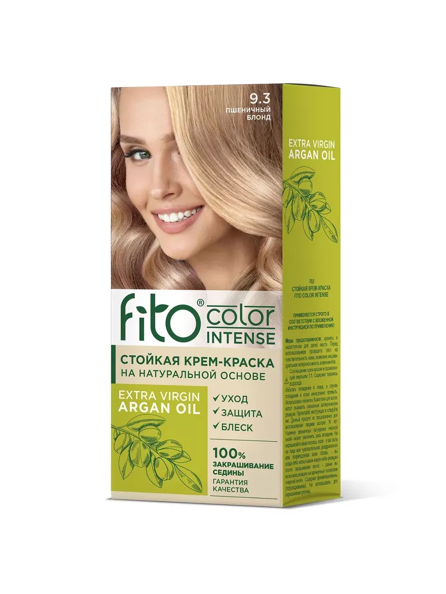 Fitoкосметик Крем-краска для волос Fito Color Intense, тон 9.3 Пшеничный блонд, 115 мл. Стойкая крем-краска для волос Fito Color Intense содержит 90% ингредиентов натурального происхождения и самые современные стойкие пигменты, которые надежно закрашивают седину, обеспечивают стойкое окрашивание и естественный многогранный цвет. Крем-краска ухаживает за волосами во время окрашивания, цветочный воск придает волосам в три раза больше блеска, глазирует поверхность волос, делает их мягкими и послушными. Результат: 100% закрашивание седины, яркий цвет и невероятный блеск.