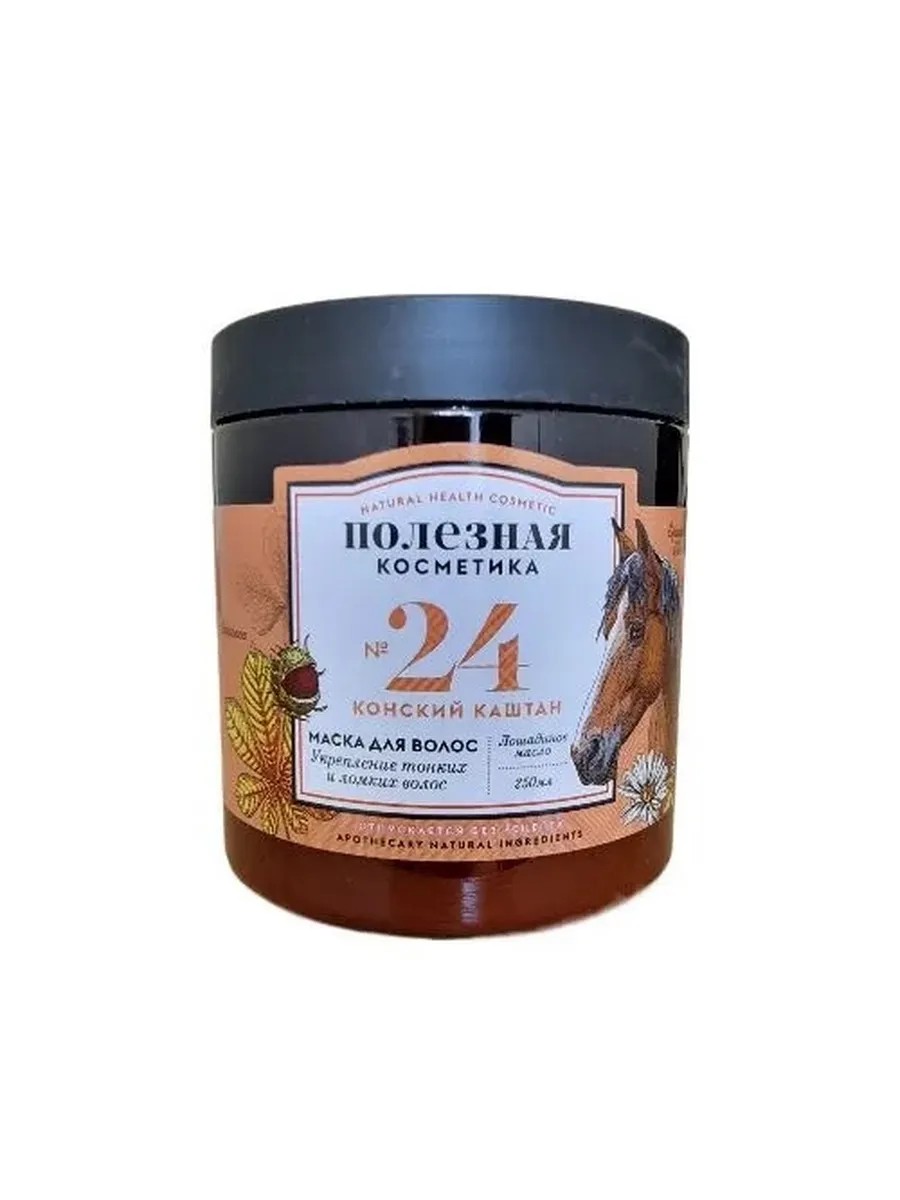 Маска № 24 отлично укрепляет тонкие и ломкие волосы, делая их более сильными, эластичными и плотными. Полезное лошадиное масло, богатое церамидами, кератином и жирными кислотами omega-3, питает, увлажняет и восстанавливает волосы, защищая их от повреждений. Экстракт конского каштана, полученный методом холодной дистилляции, который сохраняет все полезные витамины, танины и дубильные вещества, активизирует рост волос, придаёт им мягкость и объём. Результат - более здоровые, густые, блестящие волосы.