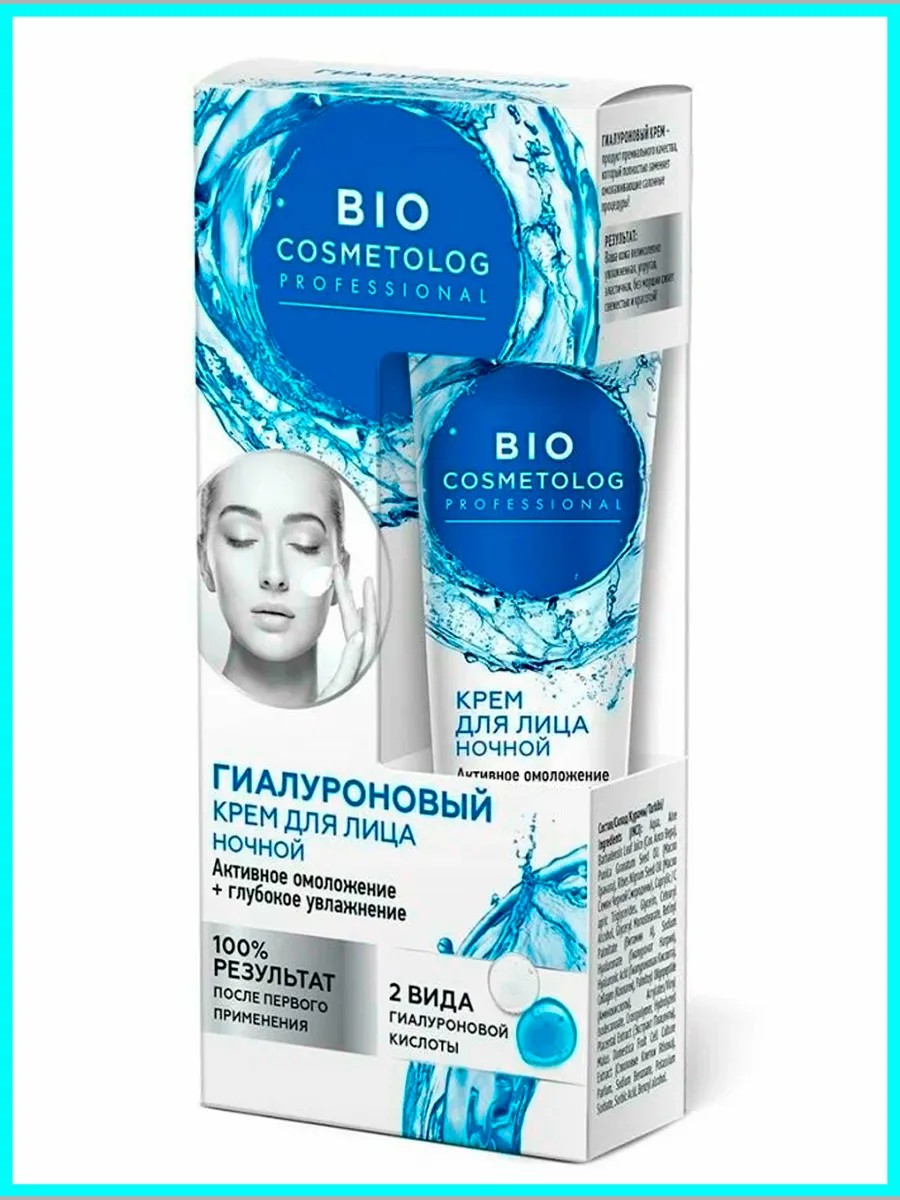 Крем для лица гиалуроновый с эффектом профессиональной биоревитализации интенсивно увлажняет и восстанавливает молодость кожи во время сна. Активная формула крема с 2 видами гиалуроновой кислоты, пептидами и коллагеном запускает процессы омоложения на клеточном уровне, ускоряет клеточное обновление, разглаживает морщины, выравнивает тон и текстуру кожи. Экстракт плаценты и стволовые клетки яблока повышают тургор кожи, обеспечивают пролонгированный эффект лифтинга, натуральные масла граната и черной смородины глубоко питают и смягчают кожу, витамин А обладает мощным омолаживающим эффектом. Ежедневное применение крема полностью заменяет профессиональную процедуру биоревитализации кожи.