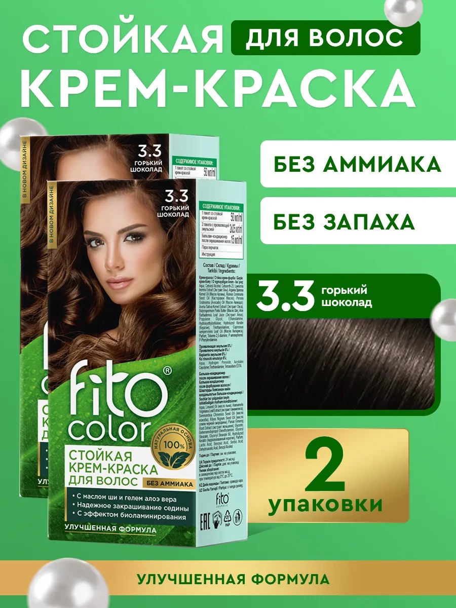 Стойкая крем-краска для волос Fitocolor без аммиака/ без запаха/ краска уход/ 115мл/ 2 шт. Стойкая крем-краска Fito Color - инновационный прорыв в сфере окрашивания волос! Безупречная формула краски не содержит аммиак и имеет 100% натуральную основу, которая дарит волосам стойкий насыщенный цвет и обладает эффектом bio- ламинирования. Нежная кремовая текстура, обволакивая каждый волос, глубоко проникает в его структуру и окрашивает в сочный, объемный, яркий, цвет. Крем-краска идеально закрашивает седину! Входящие в состав масло крапивы и экстракт шалфея интенсивно ухаживают за волосами в процессе окрашивания: питают, и восстанавливают, придают гладкость, эластичность и объем. Бальзам-кондиционер великолепно завершает процедуру окрашивания: закрепляет цвет волос, увлажняет и укрепляет, делает волосы гладкими и шелковистыми. Результат: невероятно стойкий насыщенный сияющий цвет волос без седины и надолго, роскошные густые волосы, как после салонной процедуры ламинирования волос!