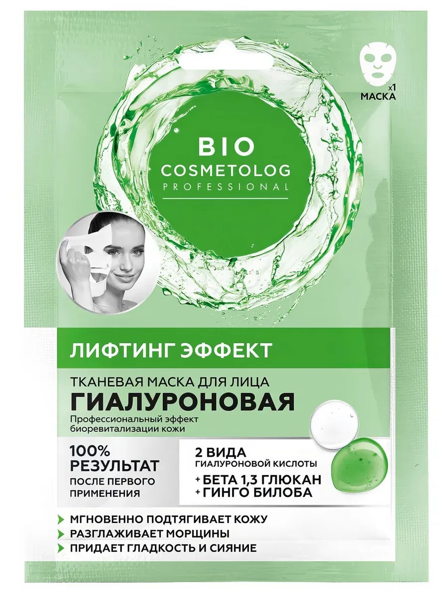 Тканевая маска BioCosmetolog Professionall для лица, гиалуроновая, лифтинг-эффект, 25 мл. Гиалуроновая тканевая маска Лифтинг эффект преображает кожу, дарит красоту, молодость и здоровое сияние уже после первого применения! Ее профессиональная формула мгновенно подтягивает кожу, укрепляет овал лица, устраняет морщины и обеспечивает профессиональный эффект биоревитализации. Два вида гиалуроновой кислоты глубоко увлажняют и омолаживают кожу на клеточном уровне. БЕТА 1, 3 глюкан повышает иммунитет кожи, разглаживает морщины, устраняет все признаки старения. Гинго билоба обладает мощным тонизирующим эффектом, делает кожу гладкой и упругой. Регулярное применение маски полностью заменяет дорогостоящие и болезненные салонные процедуры! Состав: Состав: Aqua, Rosmarinus Officinalis Extract (Экстракт Розмарина), Persea Gratissima Oil (Масло Авокадо), Prunus Amygdalus Dulcis Oil (Масло Миндаля), Ginkgo Biloba Leaf Extract (Экстракт Гинго Билоба), Hyaluronic Acid (Гиалуроновая Кислота), Beta-Glucan (Бета Глюкан), Sodium Polyacrylate, Parfum, Benzoic Acid, Sorbic Acid, Dehydroacetic Acid, Benzyl Alcohol. Способ применения: Способ применения: Вскройте упаковку и разверните маску. Наложите маску на чистое лицо. Через 10-15 мин. снимите маску, остатки средства легкими массирующими движениями распределите по коже и оставьте до полного впитывания.