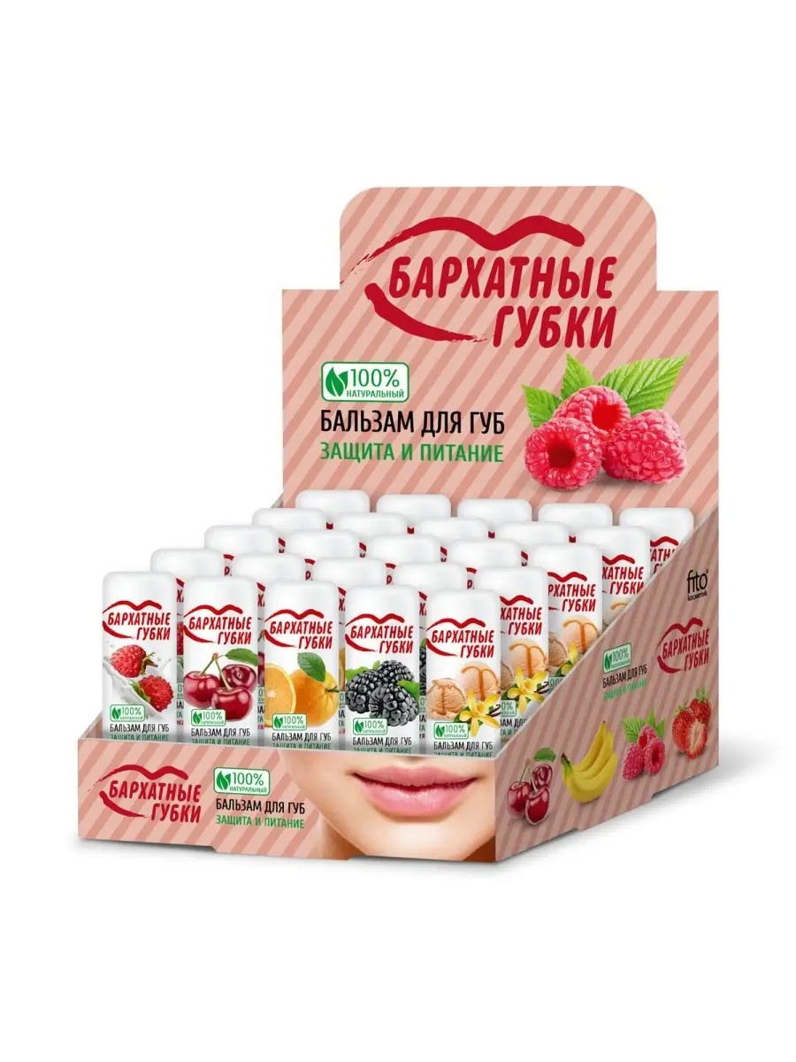 Бальзам безупречно защищает, смягчает и питает кожу губ, устраняет шелушение, делает губы гладкими и нежными.Fito Косметик, Набор бальзамов для губ Вишня, Апельсин, Мороженное, Ежевика, Земляника 25шт х 4,5г.