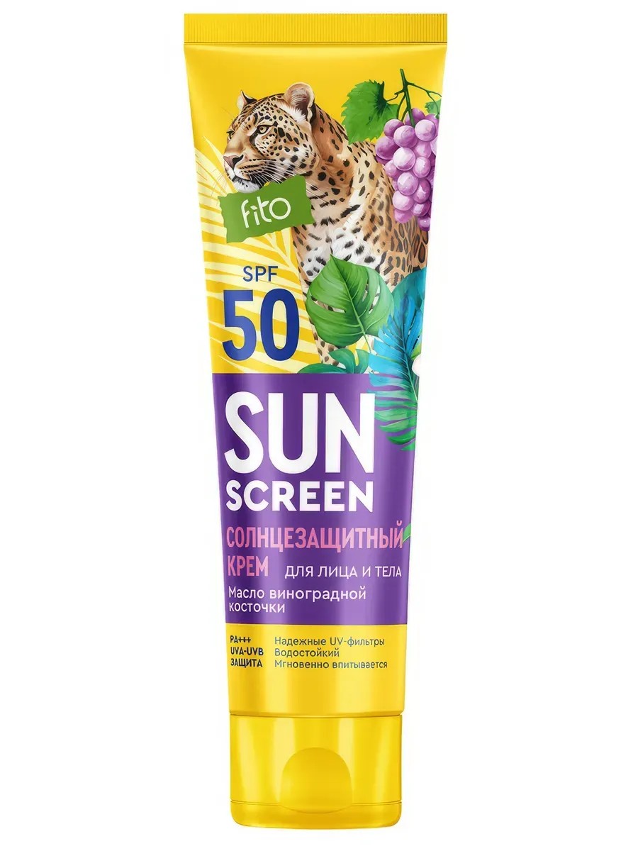 Fito Cosmetic Fito Sun Screen SPF 50 Sunscreen for Face and Body, Grapeseed Oil, 75 ml. This water-resistant cream with high UV protection provides additional antioxidant care for your skin. Photostable UV filters protect the skin, while antioxidants maintain its youthful appearance and prevent photoaging. Peach kernel oil and vitamin E deeply moisturize, soften, and tone the skin, helping to achieve an even bronze tan. Ingredients: Aqua, Vitis Vinifera Seed Oil, Prunus Persica Kernel Oil, Octocrylene, Ethylhexyl Methoxycinnamate, Ethylhexyl Salicylate, Butyl Methoxydibenzoylmethane, Benzophenone-3, Rosa Canina Fruit Juice, Glyceryl Stearate, Ubiquinone, Tocopherol, Acrylates/Vinyl Isodecanoate Crosspolymer, Benzyl Alcohol, Parfum. Directions: Apply evenly with light, circular motions to clean, dry skin before sun exposure. Reapply regularly to maintain protection.