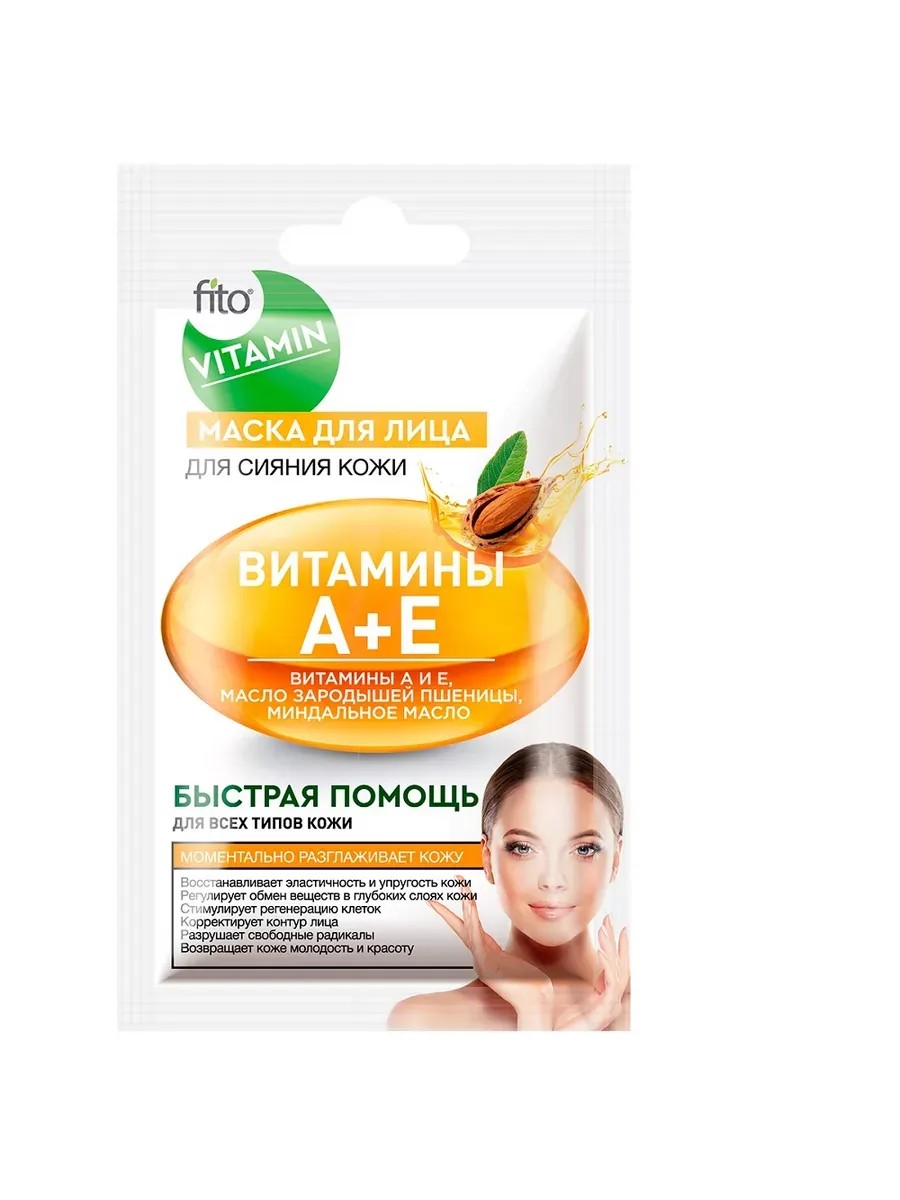 Маска для лица Fito Vitamin Витамины А+Е для сияния кожи – интенсивная маска для всех типов кожи, в состав которой входят главные витамины красоты А и Е. Маска глубоко ухаживает за кожей, мгновенно освежает тон лица и придает сияние.Витамин А глубоко проникает в кожу и действует как мощный антиоксидант. Он разглаживает и успокаивает кожу, предотвращает воспалительные процессы и защищает от возрастных изменений. Витамин Е защищает кожу от действия свободных радикалов, фотостарения и факторов окружающей среды. Масло зародышей пшеницы содержит близкие коже растительные протеины. Оно способствует выработке коллагена и способствует обновлению эпидермиса. Миндальное масло глубоко питает и увлажняет на клеточном уровне.