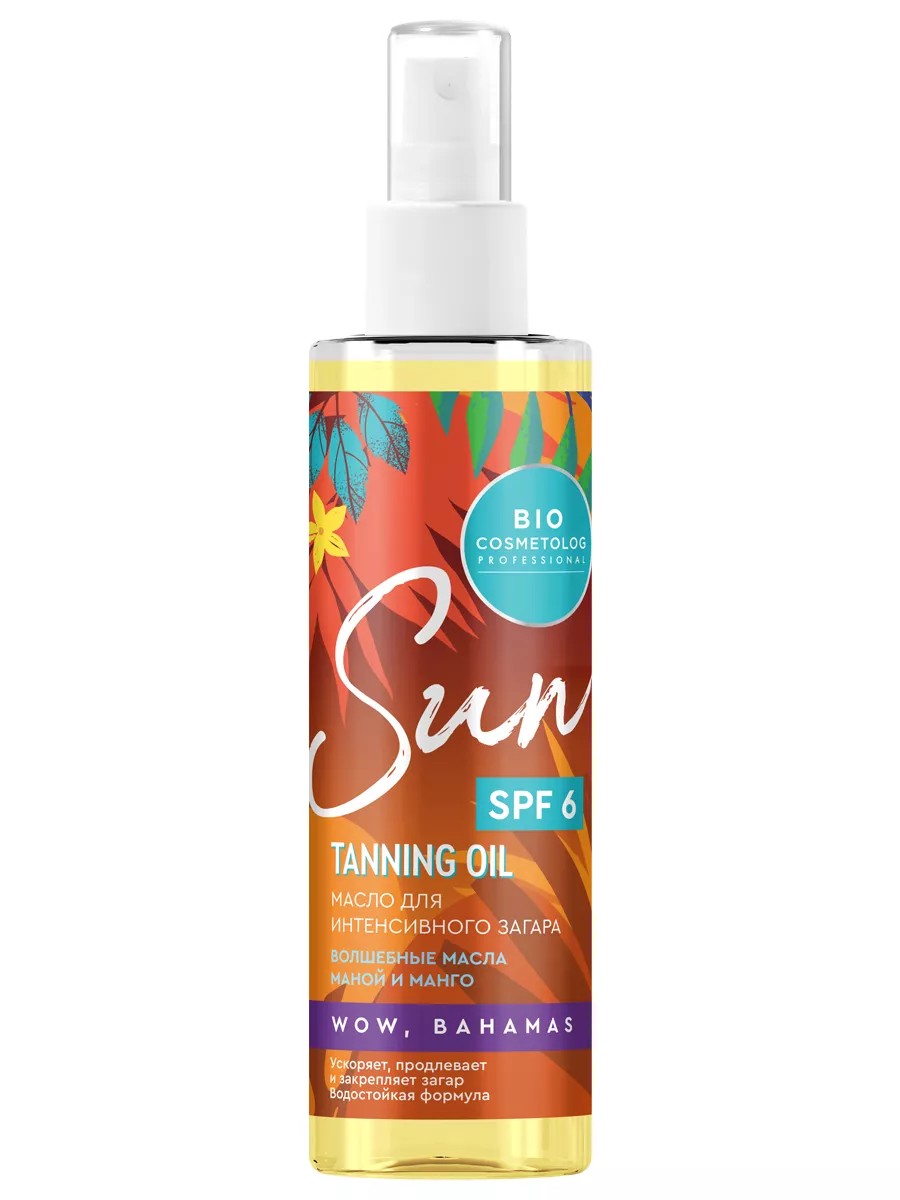 Масло помогает приобрести красивый и ровный загар и защитить кожу от UV-лучей. Масло делает кожу нежной и бархатистой и подготавливает ее к загару на солнце. Масло Моной насыщает кожу витаминами А и Е. Масло манго глубоко питает и увлажняет, оставляет легкий тропический аромат. Масло кокоса питает кожу, защищает от воздействия соленой и хлорированной воды. Бета-каротин усиливает загар и помогает надолго сохранить красивый шоколадный оттенок кожи. Фито Косметик представляет Масло-спрей Bio Cosmetolog для интенсивного загара с фактором защиты SPF6. Масло помогает приобрести ровный и красивый загар, защищая кожу от негативного воздействия ультрафиолетовых лучей.
