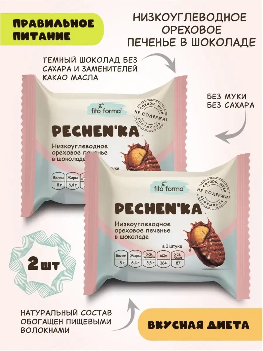 Низкоуглеводное ореховое печенье БЕЗ сахара, муки и крахмала в шоколаде - полезная замена классическому печенью Мягкий бисквит ПП десерта без сахара, вкупе со вкусом знакомым с детства, поможет Вам по-новому взглянуть на низкоуглеводные, полезные сладости без сахара и диетическое питание в целом! Наше печенье БЕЗ сахара - полезный десерт с полностью чистым составом, который готовится по традиционному рецепту с использованием продуктов с низким гликемическим индексом и пониженным содержанием жира, а так же содержит исключительно натуральные сахарозаменители: эритритол и изомальт оолигосахарид. ПП печенье без сахара от Fito Forma - это по-настоящему диетические продукты для похудения, низкоуглеводная продукты и низкокалорийные продукты, которые, без сомнения, можно охарактеризовать как правильные, умные сладости без сахара 21 века! По мимо того, что представленные ПП сладости Без сахара, они так же без глютена и без фруктозы. Это самые необычные сладости из всех представленных в категории правильное питание, так как соотношение вкуса и пользы можно использовать в качестве эталона! Наше диетическое печенье отлично подойдут как: здоровый и полезный перекус, сладости в подарок, дюкан продукты, здоровое питание на каждый день, полезные сладости для детей, диетическое питание для похудения. Обратите Внимание, что наши полезные, диетические сладости относятся в первую очередь к ПП продуктам, а не к продуктам для диабетиков.Состав: натуральные подсластители: эритрит, мальтит, стевиозид; изомальтоолигосахарид (пребиотик), яйчный меланж, семена подсолничнмка, растительные пищевые волокна, какао тертое, какао масло, сыворотка молочная сухая, какао порошок, пребиотик инулин,миндаль, натуральный ароматизатор, разрыхлитель, консервант сорбат калия, эмульгатор соевый лецитин. Количество усваиваемых калорий без пищевого волокна 174 кКал Общая калорийность с учетом пищевого волокна 212.4 кКал, 16 г пищевые волокна, 8 г белки, 12,7 г жиры 6,7 г, углеводы. Срок годности 6 месяцев при температуре от +10 до +25 С градусов. Вес 50 г.