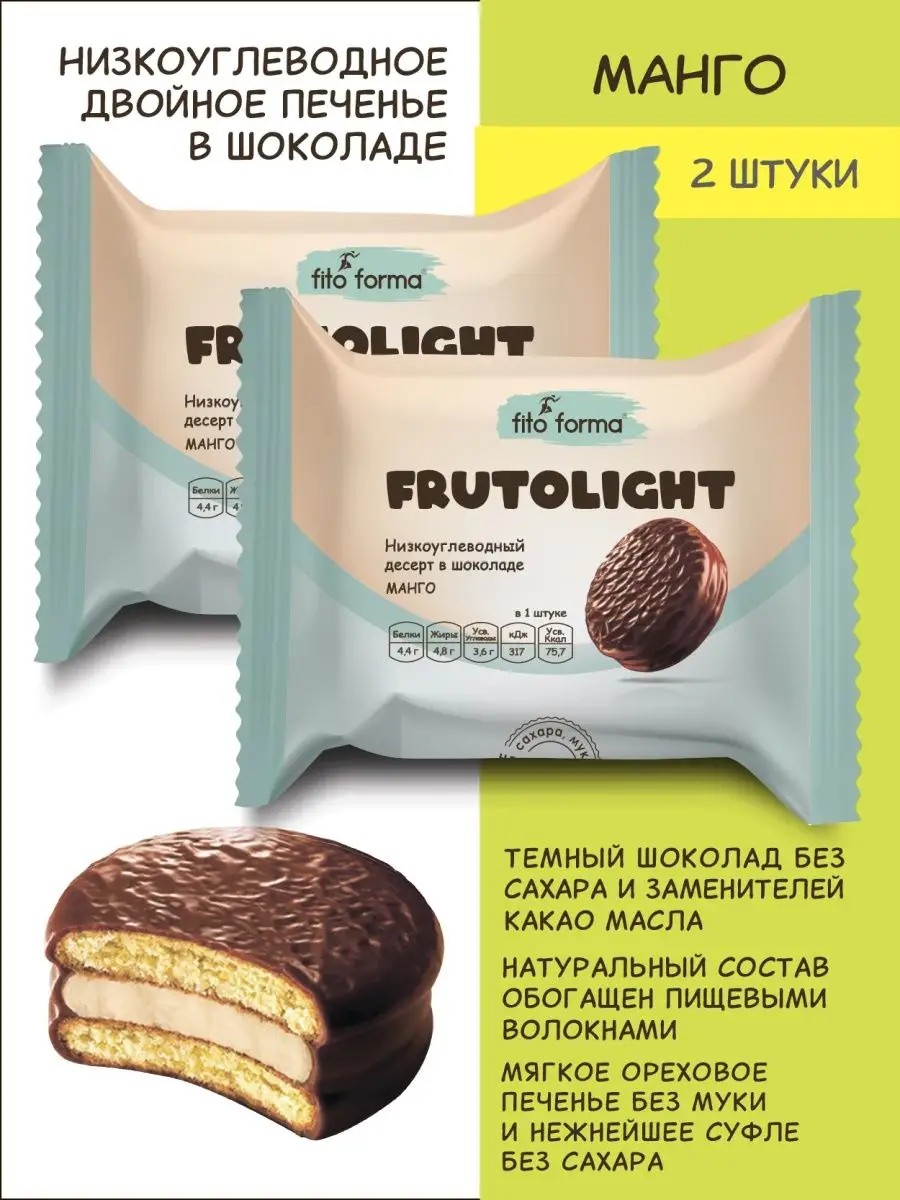 FrutoLight Mango-flavored, low-carb cookies with NO sugar, flour, or starch are a healthy alternative to the classic Choco Pie! The soft sponge cake and delicate soufflé of our sugar-free healthy dessert, coupled with a flavor familiar from childhood, will help you rethink low-carb, healthy, sugar-free sweets and dietary nutrition in general! Our sugar-free cookies are a healthy dessert with a completely clean composition, made according to a traditional recipe using low-glycemic index and reduced-fat ingredients, and also contain exclusively natural sweeteners: erythritol and isomalt oligosaccharide. Fito Forma's sugar-free healthy cookies are truly dietary products for weight loss, low-carb, and low-calorie, which undoubtedly can be described as the healthy, smart, sugar-free sweets of the 21st century! In addition to being sugar-free, our healthy sweets are also gluten-free and fructose-free. These are the most unique sweets in the healthy eating category, as the balance of taste and nutrition can be used as a benchmark! Our dietary cookies are perfect as: a healthy snack, a sweet gift, Dukan products, healthy everyday meals, healthy sweets for children, and dietary nutrition for weight loss. Please note that our healthy, dietary sweets are primarily considered healthy foods, not products for diabetics. Ingredients: natural sweeteners: erythritol, maltitol, stevioside; Isomaltooligosaccharide (prebiotic), egg liquid, sunflower seeds, cocoa mass, cocoa butter, whey powder, vegetable dietary fiber, gelatin, almonds, prebiotic inulin, freeze-dried mango, acidity regulator citric acid, natural flavoring, preservative potassium sorbate, baking powder, natural colors: safflower extract, carmine; emulsifier soy lecithin. - The number of digestible calories without dietary fiber is 137.6 kcal. Total calories including dietary fiber are 188 kcal. 21 g dietary fiber, 8 g protein, 8.8 g fat, 6.6 g carbohydrates (digestible) - Shelf life is 6 months at a temperature of +2 to +25 C degrees. Weight 55 g.