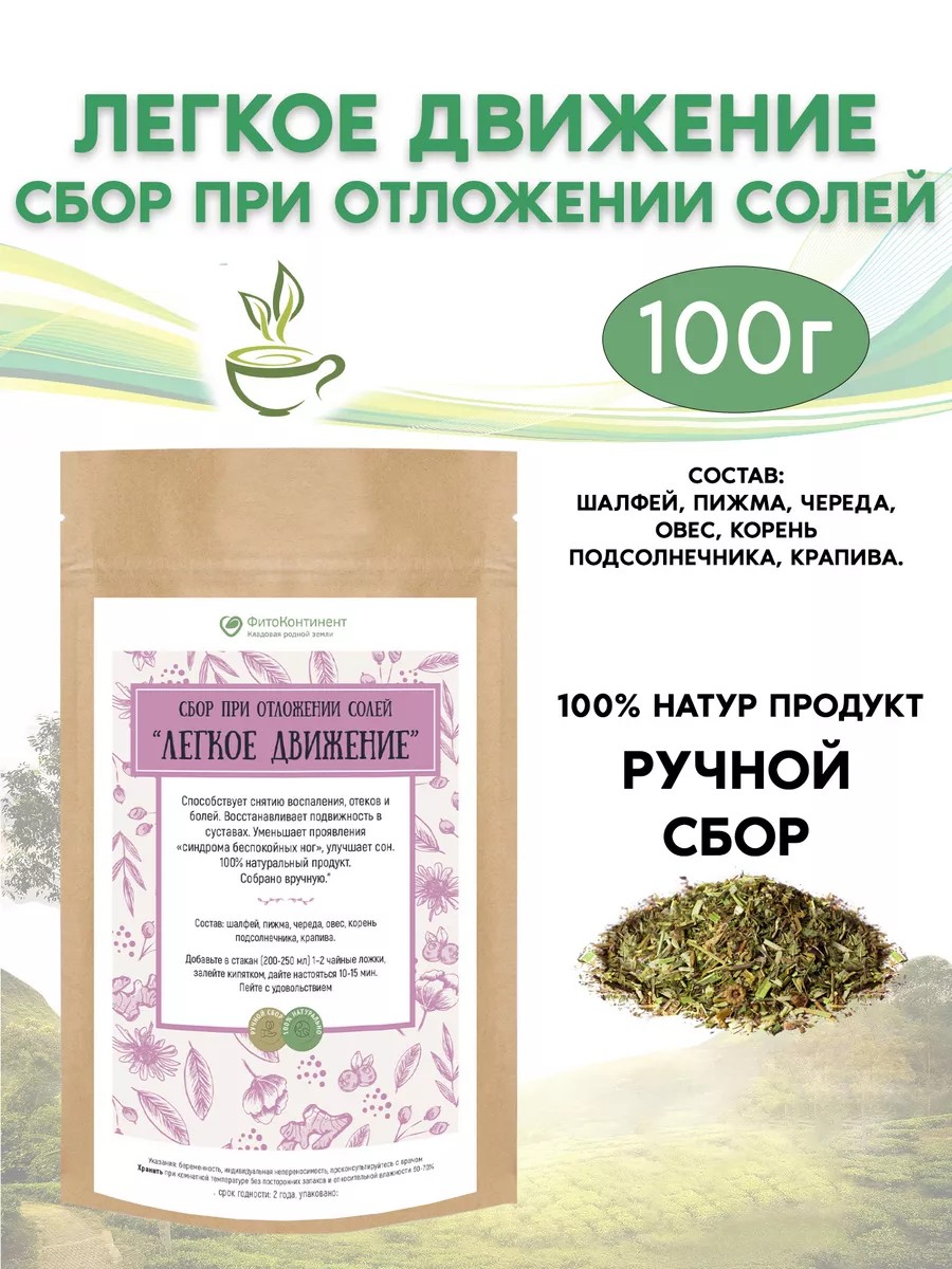 Сбор трав при отложении солей Легкое движение востребованное и эффективное средство при различных болезнях суставов, которые все чаще беспокоят пациентов с возрастом. Этот комплекс лекарственных растений имеет декларацию соответствия, что гарантирует безопасность и качество его компонентов. Сбор При отложении солей рекомендуется при следующих заболеваниях:шейный, грудной, поясничный остеохондроз позвоночника;радикулит, ишиас;артриты, подагра;деформирующий остеоартроз;синдром позвоночной артерии;эндокринные заболевания, ожирение;боли, скованность, хруст в суставах.Травяной сбор При отложении солей помогает естественным образом улучшать питание хряща, выводить соли и шлаки, повышать эластичность и упругость тканей, снимать боль и тугоподвижность в суставах.