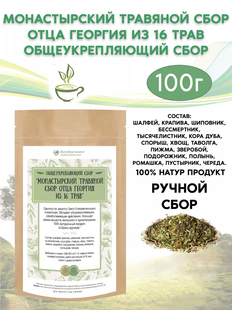 Монастырский травяной сбор отца Георгия из 16 трав приготовлен по рецепту Свято Елизаветинского монастыря. Он обладает общеукрепляющим, обезболивающим действием, улучшает обмен веществ. Сбор из 16 трав отца Георгия рекомендуется при:болях в желудке, тошноте, отрыжке, нарушении пищеварения;заболеваниях поджелудочной железы;признаках сахарного диабета;отеках на ногах, животе асцит;болях в спине, вызванных грыжей межпозвонкового диска;общей слабости;онкологических заболеваниях. В состав общеукрепляющего сбора Монастырский травяной сбор отца Георгия входят 16 трав: Шалфей, крапива, шиповник, бессмертник, тысячелистник, кора дуба, спорыш, хвощ, таволга, пижма, зверобой, подорожник, полынь, ромашка, пустырник, череда.