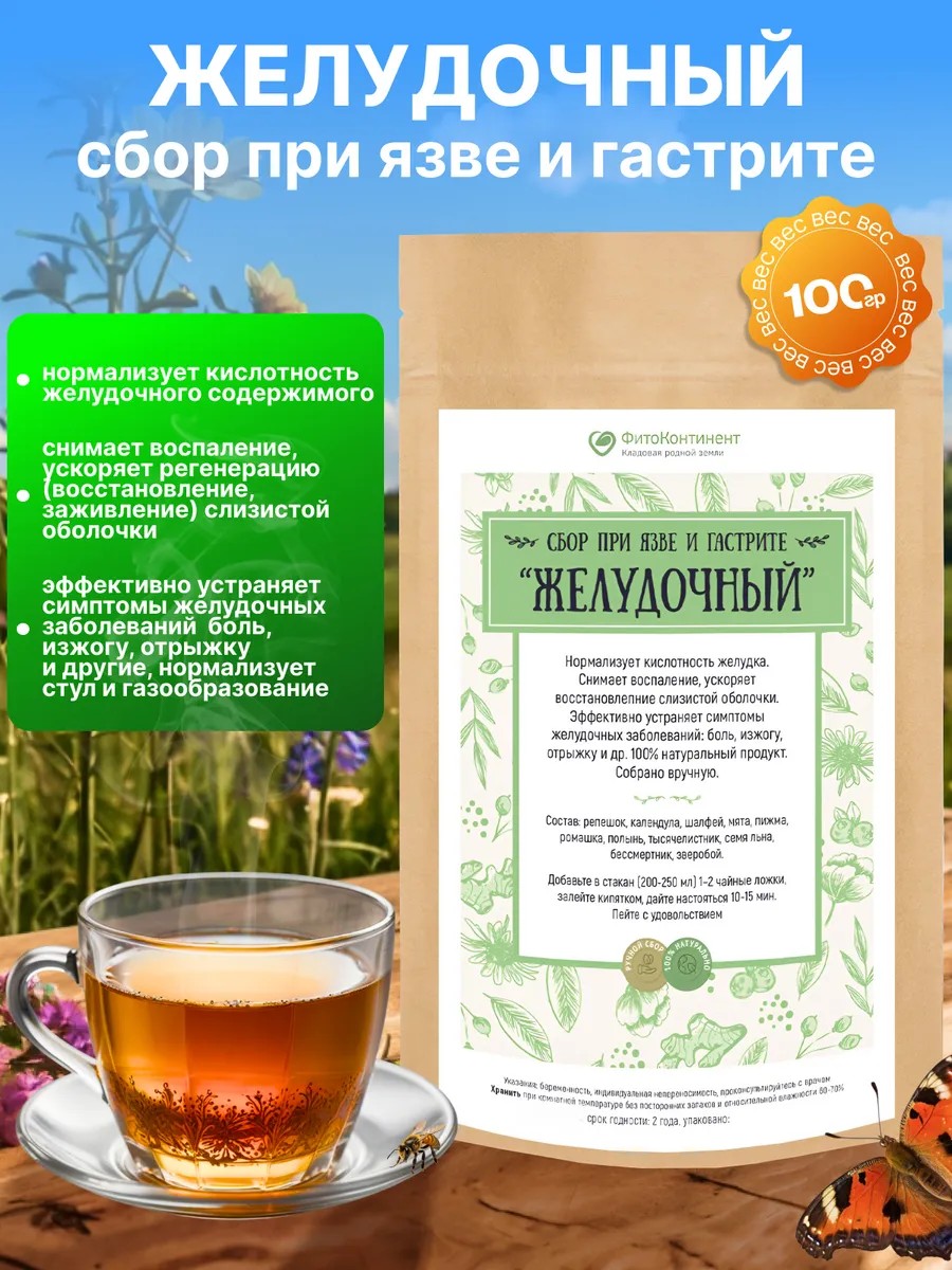 Лечебные сборы для желудка издавна применяются в народной медицине при заболеваниях желудочно-кишечного тракта. Лекарственные растения помогают при гастрите, язве, функциональной диспепсии, гастропатии и т. д. изжоге, ощущении жара за грудиной; неприятном привкусе во рту, изменении вкусовых ощущений, потере аппетита; отрыжке — выделении воздуха или частичек пищи из пищевода после еды, нередко с неприятным запахом, кислым или горьким привкусом; тошноте и рвоте, обычно появляющихся через определенное время после еды; сопутствующем вздутии живота, жидком стуле или хронических запорах. Почему натуральные средства лучше таблеток. Желудочно-кишечные травяные сборы состоят только из лекарственных растений, без химических добавок. Они естественным образом регулируют выделение желудочного сока, способствуют заживлению поврежденных стенок желудка. Травяной сбор для желудка и кишечника можно принимать при заболеваниях желудочно-кишечного тракта длительно. Он не только устраняет симптомы, но и восстанавливает нормальную работу органов пищеварения. Растения в желудочном сборе подобраны специально для мягкого, но эффективного влияния на желудочно-кишечный тракт. Они полезны не только для лечения, но и для профилактики обострений при хронических болезнях пищеварительной системы. В состав сбора при язве и гастрите «Желудочный» входят 11 компонентов Репешок. Снимает воспаление и обезболивает. Календула. Активно борется с воспалением, снимает раздражение стенок желудка, обладает противомикробным эффектом. Шалфей. Улучшает пищеварение, устраняет спазмы желудка, предотвращает вздутие кишечника. Мята. Помогает при рвоте, успокаивает нервную систему, способствуя снижению выработки желудочного сока. Пижма. Заживляет язвы, снимает воспаление и боль. Ромашка. Дезинфицирует, снимает спазмы, боли, улучшает пищеварение, устраняет изжогу и отрыжку. Полынь. Улучшает аппетит и пищеварение при тошноте, устраняет отрыжку и вздутие живота, повышает кислотность желудочного сока .Тысячелистник. Улучшает пищеварение, полезен при отрыжке и повышенном газообразовании, снимает воспаление и дезинфицирует. Семя льна. Входит практически в любой желудочно-кишечный сбор трав при язве желудка, повышенной кислотности, мягко обволакивает стенки, заживляет повреждения, обладает бактерицидным действием. Бессмертник. Устраняет спазм мышц желудка и желчевыводящих путей, улучшает пищеварение. Зверобой. Полезен при изжоге, вздутии живота, помогает как при повышенной, так и при пониженной кислотности.