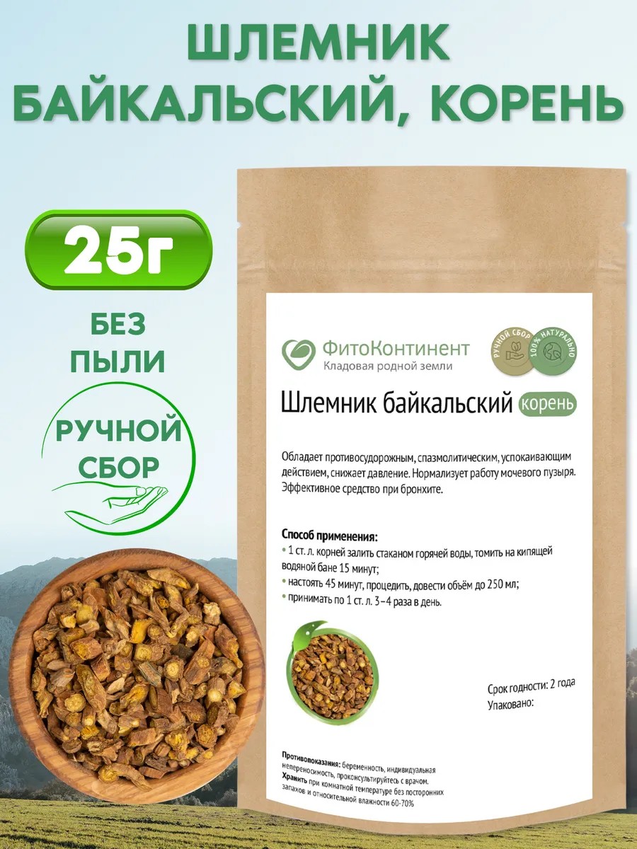 Шлемник байкальский корень применяется:при нарушении функций сердечно-сосудистой системы;в качестве успокаивающего и адаптогенного средства;при проявлениях нервных расстройств;при хронической усталости, астеническом синдроме, головных болях;при последствиях интоксикаций;при заболеваниях органов дыхания;для облегчения эпилептических приступов;для устранения симптомов предменструального синдрома.Лечебные свойстваЭто растение незаменимо при гипертонической болезни и связанных с ней нарушениях работы сосудов. Лечебные свойства корня шлемника байкальского включают способность регулировать ритм сокращений сердца, оказывать мягкое седативное действие.В состав шлемника входит много биологически активных элементов:флавоноиды;кумарины, сапонины;стероидные соединения;смолы и дубильные вещества;минералы: йод, селен, марганец, цинк, железо, медь.Корень шлемника — универсальное средство от хронической усталости, связанной с физическим или нервным перенапряжением, головных болей, слабости, апатии, невротических отклонений, проблемах со сном. Он помогает справиться с плохим самочувствием и раздражительностью при изменениях погоды, предменструальном синдроме, облегчает симптомы вегетососудистой дистонии, стенокардии, миокардита, аритмии. На начальной стадии гипертонической болезни его применяют в составе комплексной терапии как мягкое гипотензивное средство.Шлемник травяной сбор благотворно влияет на состояние желудочно-кишечного тракта: устраняет диспепсические проявления, запоры, снимает спазмы гладких мышц кишечника, останавливает внутренние кровотечения, ликвидирует застой желчи, оказывает противовоспалительное, вяжущее и гепатопротекторное действие при заболеваниях печени и желчного пузыря.Корень обладает антибиотическими и жаропонижающими свойствами, улучшает самочувствие при гриппе, бронхите, воспалении легких, менингите, способствует снятию отечности, выведению мокроты и токсинов из организма, замедляет рост раковых клеток. Прием препаратов на его основе снижает синтез плохого холестерина, препятствует сгущению крови и тромбообразованию, нормализует эндокринные функции щитовидной железы.Благодаря выраженному антигистаминному действию, шлемник байкальский — хорошее средство для устранения различных аллергических проявлений.Корень растения применяют в качестве кровоостанавливающего средства для обмывания длительно незаживающих ран, лечения дерматозов, улучшения состояния проблемной кожи, склонной к угревой сыпи.Отвары и настойки шлемника помогают избавиться от многих паразитарных заболеваний.
