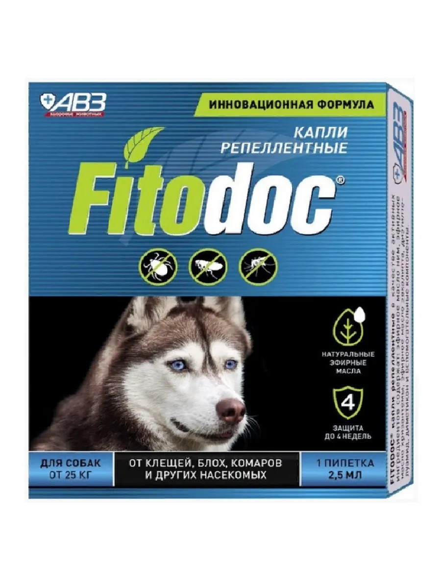 Fitodoc, Капли репеллентные для собак от 25 кг, 2.5 мл. Капли применяют щенкам с 4-недельного возраста, собакам, в том числе беременным, больным, ослабленным и склонным к аллергии животным, для защиты от нападения блох, вшей, власоедов, комаров, мошек и клещей. Способ применения: отломать верх пипетки и, раздвинув шерсть, нанести капли на кожу вдоль позвоночника в недоступные для слизывания капель места — в области шеи у основания черепа или между лопатками, в дозах, указанных в таблице. Для достижения максимального эффекта капли наносят в наибольшее количество точек.