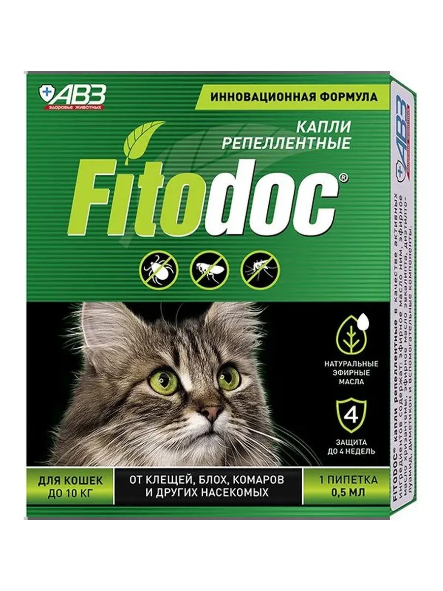 FITODOC капли репелентные для кошек, предназначены для обработки животного от блох, вшей, власоедов, комаров, мошек, клещей.