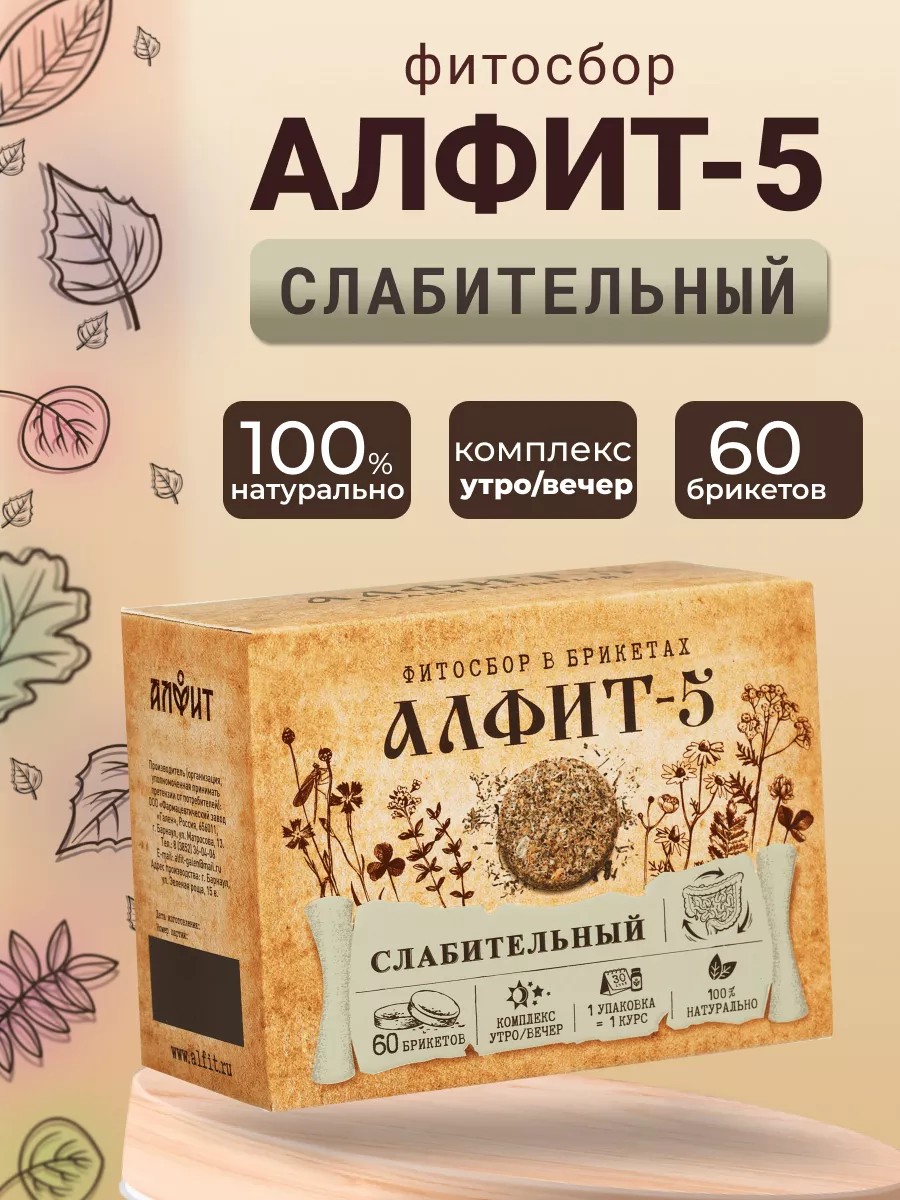 Помогает справиться с запором и активизировать работу кишечника. Состоит из натуральных трав, оказывающих комплексное воздействие на органы пищеварения.Главные компоненты сбора - кассия (сенна) и кора крушины. Их слабительное действие известно еще с древних времён. Современная медицина доказала, что кассия и крушина содержат специальные вещества - антрагликозиды.Сами по себе антрагликозиды малоактивны. Но в пищеварительном тракте они постепенно трансформируются и раздражают стенки толстого кишечника. Этот процесс завершается опорожнением кишечника через 6-8 часов.Растительные антрагликозиды могут вызывать спазмы кишечника. Но этому препятствуют успокаивающее действие ромашки и смягчающие слизистые вещества семени льна. А чага и солодка способствуют длительной нормализации перистальтики кишечника.«Алфит-5» входит в серию фитосборов «Алфит». Все они изготовлены из экологически чистых трав Горного Алтая, Кавказа и Приморья. А состав фитосборов разработан на основе народных рецептов траволечения, которые веками помогали людям.Комплект «Алфит» состоит из двух упаковок: утреннего и вечернего фитосбора. В каждой из них – 30 брикетов по 2 грамма. Вечерняя форма отличается добавлением успокаивающих трав.Брикет содержит только натуральные измельченные травы. Такая форма выпуска даёт ряд преимуществ: исключает передозировку и сохраняет биологически активное действие трав. А также позволяет готовить целебный настой, используя только кипяток, а не водяную баню.Сборы совместимы с другими лекарственными средствами и между собой. Каждый «Алфит» оказывает направленное действие на определённую систему или орган. Но все они укрепляют иммунитет и повышают сопротивляемость организма. Это основа при лечении любого заболевания.Мягкое и разноплановое действие фитосборов «Алфит» позволяет с помощью врача составлять индивидуальные оздоровительные программы на длительные сроки. Применение совместно с препаратами серии «Экстал» значительно усиливает лечебное действие «Алфитов».Показания к применениюОстрые и хронические запоры.Долихосигма (сегментарная).Хронический спастический колит.Воздействие на организмПомогает избавиться от острых и хронических запоров.Нормализует работу пищеварительной системы.Усиливает перистальтику кишечника.Укрепляет иммунитет и повышает сопротивляемость организма.Способ примененияОдин брикет (утром – утренний, вечером – вечерний) залить стаканом кипятка (150-200 мл) и настоять 5-10 минут. Полученный настой можно выпивать с осадком, который оказывает дополнительное лечебное действие.Принимать по 1 брикету 2 раза в день за 30 минут до еды. Минимальный курс лечения - 1 месяц. При обострении хронических заболеваний целесообразны 2-3 курса с перерывами между ними в 1 неделю. В тяжелых случаях возможен прием 2-х или 3-х сборов одновременно.При вялотекущих заболеваниях лучше чередовать приём сборов, принимая их через день. Продолжительность курса в этом случае составляет 2-3 месяца.Для детей с 3 до 5 лет дозировку необходимо уменьшить до 1/4 брикета 2 раза в день, с 5 до 12 лет – 1/2 брикета 2 раза в день, после 12 лет – взрослая дозировка.Для людей, склонных к аллергическим реакциям, рекомендуется первые 2-3 приёма уменьшить дозировку в 4 раза.Форма выпускаКомплект из двух упаковок (утренний и вечерний «Алфит»). В к