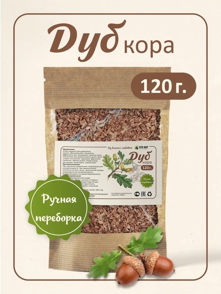 Oak bark is valued in Altai folk medicine and pharmaceuticals for its tannins. They have anti-inflammatory, wound-healing and hemostatic effects. Oak bark herb is used externally and internally in the form of decoctions, infusions and tinctures. **Externally** for dermatitis, burns, frostbite, bedsores. Herbal collection of oak bark for gums and teeth, inflammation of the oral cavity, toothache, sore throat, tonsillitis, laryngitis, pharyngitis, stomatitis, dental plaque helps with gargling. Internally for diarrhea (loose stools), dysentery, poisoning. **Decoction** is prepared in an enamel bowl: 2 tbsp. pour 200 ml. boiling water. Cook in a water bath in boiling water for 30 minutes. Strain, squeeze. Use as a rinse or apply to the skin 6-8 times daily. Infusion: Pour 200 ml of boiling water over 2 tablespoons of dried oak bark, let steep for 15 minutes, then strain. **Contraindications:** When taken internally, it may cause liver or kidney problems, constipation, or individual intolerance. Oak bark is not recommended during pregnancy.