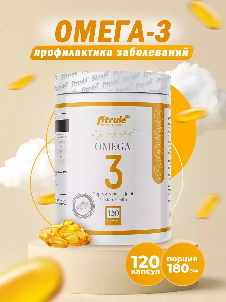 Fitrule Omega-3s are polyunsaturated fatty acids derived from fish oil. They are essential for our body and are obtained only through food. They primarily serve structural functions in the body, forming part of the cell membranes of every organ and tissue. They maintain a balance between "good" (HDL - high-density lipoprotein) and "bad" (LDL - low-density lipoprotein) cholesterol. An Omega-3 deficiency leads to a decrease in HDL, which disrupts cholesterol transport through the blood vessels. As a result, cholesterol begins to deposit on the walls of small, medium, and large vessels, forming cholesterol plaques. Blood flow is impaired. This condition provokes the development of atherosclerosis, which can eventually lead to myocardial infarction or stroke. Beneficial Omega-3 fats are part of the myelin sheath of nerves, which ensures the conductivity of electrical signals from one nerve cell to another, supporting the protection and stable functioning of the brain (central nervous system). PUFAs (polyunsaturated fatty acids) are especially important for healthy hair, maintaining its structure and functionality, preventing breakage and dryness, maintaining shine and thickness, and protecting against dandruff and hair loss. Omega-3, in the form of phospholipids, is found in large quantities in liver cells, ensuring its protection, functionality, and restoration. Polyunsaturated fatty acids (Omega-3s) should make up to half of all fats consumed by the body. A prolonged Omega-3 deficiency can lead to a general loss of energy, disruption of the stable functioning of organs and systems, and a decline in immunity and overall health. Polyunsaturated fatty acids should be taken daily and be an integral part of the diet. Serving size: 1 capsule Servings per container: 90 Amount per serving: Fish oil – 1360 mg PUFA Omega-3 fatty acids – 350 mg EPA (eicosapentaenoic acid) – 180 mg DHA (docosahexaenoic acid) – 80 mg Directions: Take one serving (1 capsule) 1-2 times daily after meals, depending on your diet, body weight, goals, and level of physical activity.
