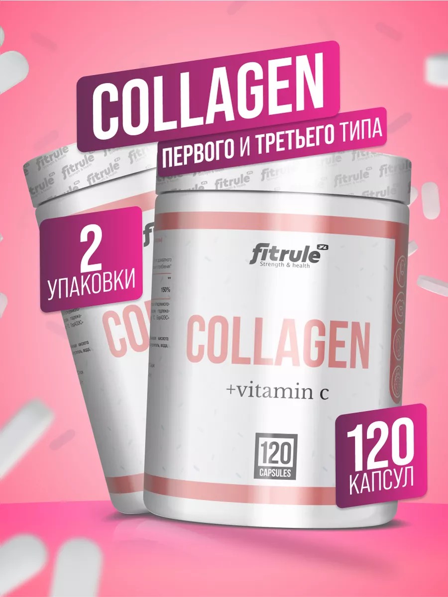 2 БАНКИ Fitrule Collagen Vitamin C 120 caps – это гидролизированный животный коллаген в капсулах. Имеет в составе весь спектр аминокислот, идентичный тому, который содержит коллаген человеческого тела. В составе дополнительно присутствует витамин С (аскорбиновая кислота) для лучшего усвоения и стимуляции синтеза собственного коллагена.