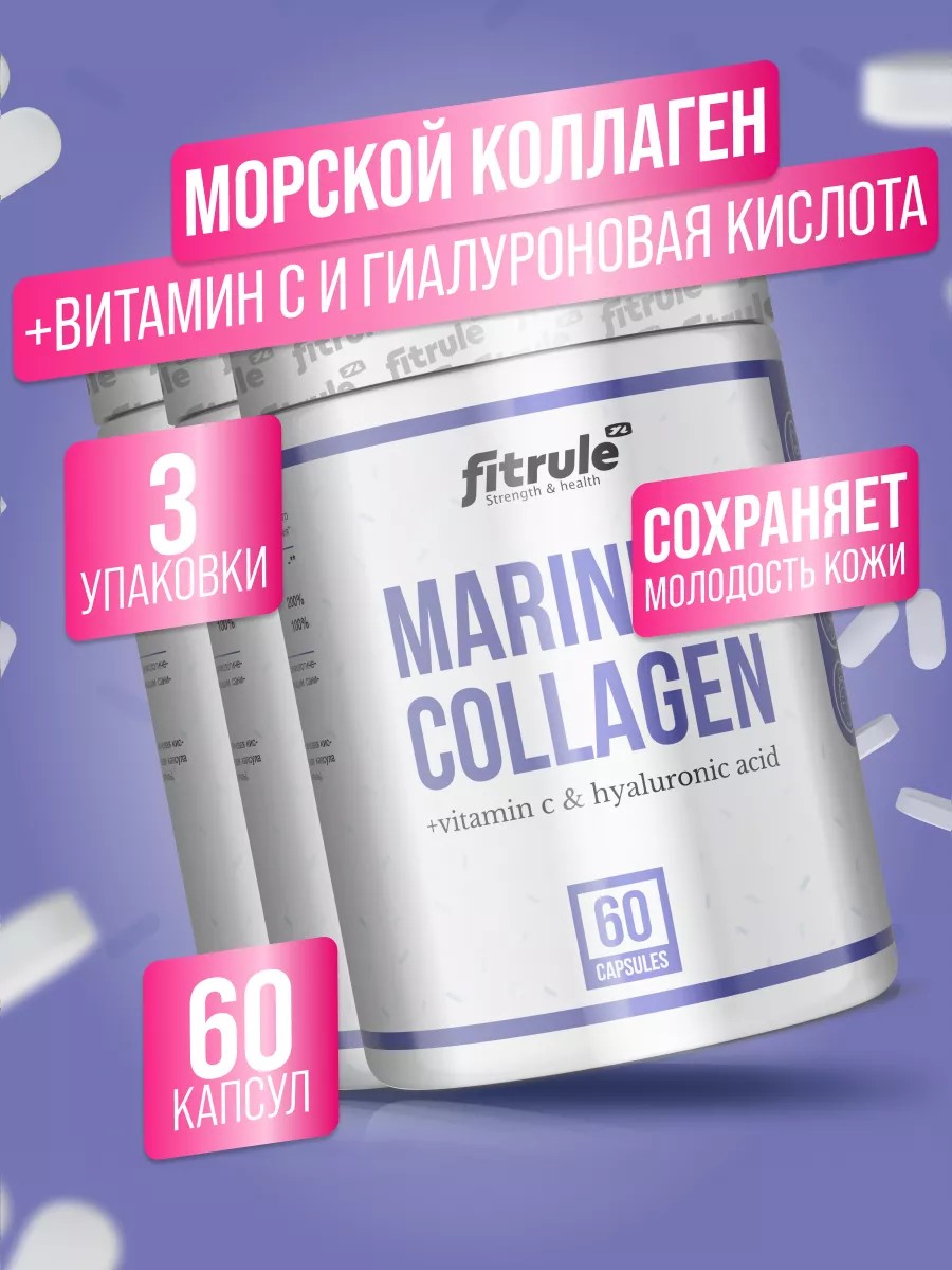 3 БАНКИ Fitrule Marine collagen Vitamin C hyaluronic acid 60 caps – это гидролизированный морской коллаген, в состав которого входит весь спектр аминокислот, необходимый человеческому телу.