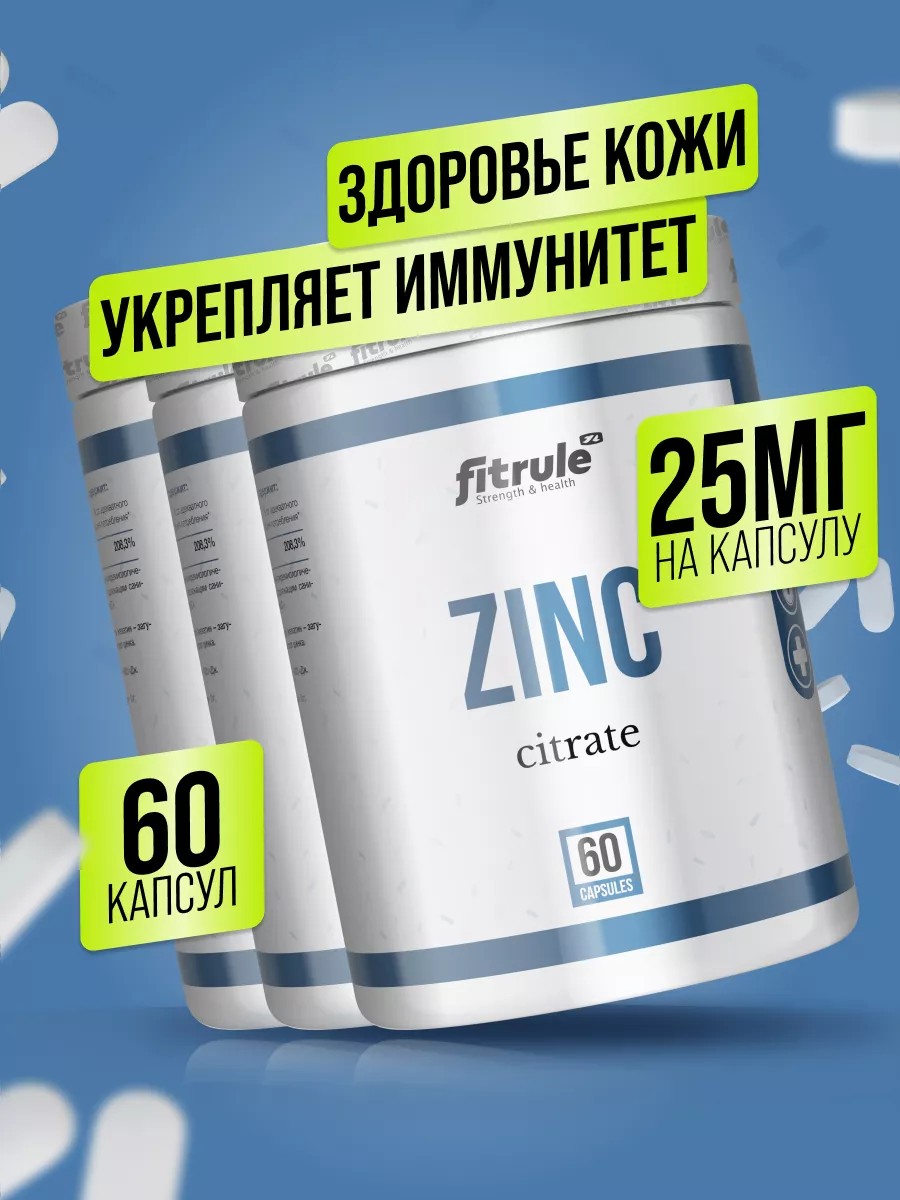 3 БАНКИ Fitrule Zinc Citrate 60 caps – цинк является одним из важнейших микроэлементов, который входит в состав более 400 ферментов, тем самым поддерживая метаболизм и работу большинства систем организма.
