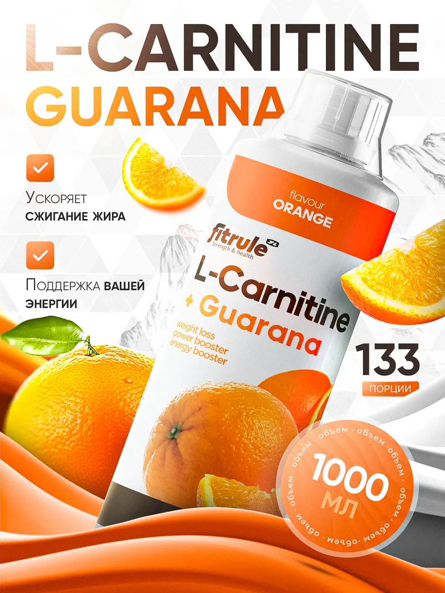 Fitrule L-Carnitine Guarana concentrate 1000ml – это концентрат л-карнитина в комплексе с гуараной. Л-карнитин выполняет транспортную функцию, то есть переносит жирные кислоты в митохондрии в мышечной (и не только) клетке, где они превращаются в энергию. Таким образом, л-карнитин стимулирует процесс жиросжигания.