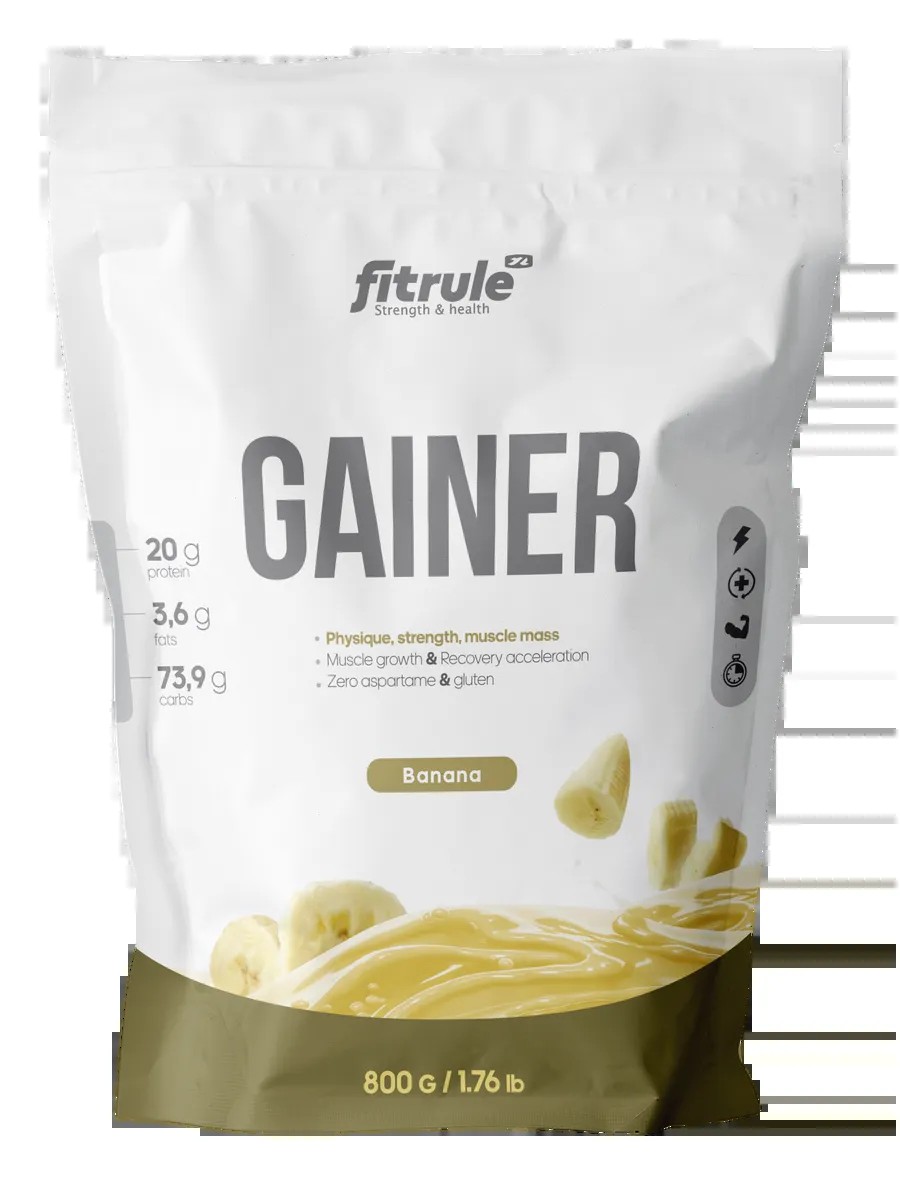 Fitrule Gainer 800g is a protein and carbohydrate complex for weight gain or muscle mass.