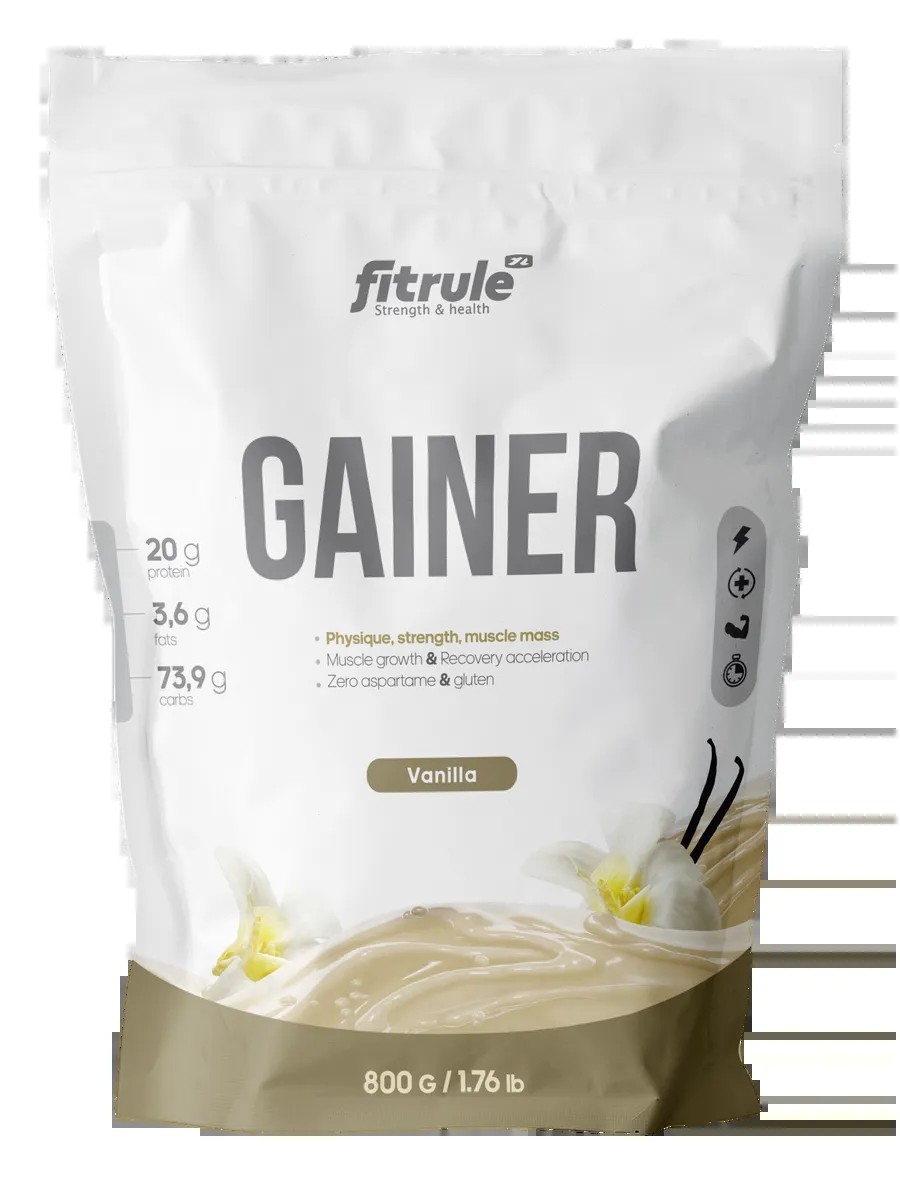 Fitrule Gainer 800g is a protein and carbohydrate complex for weight gain or muscle mass.
