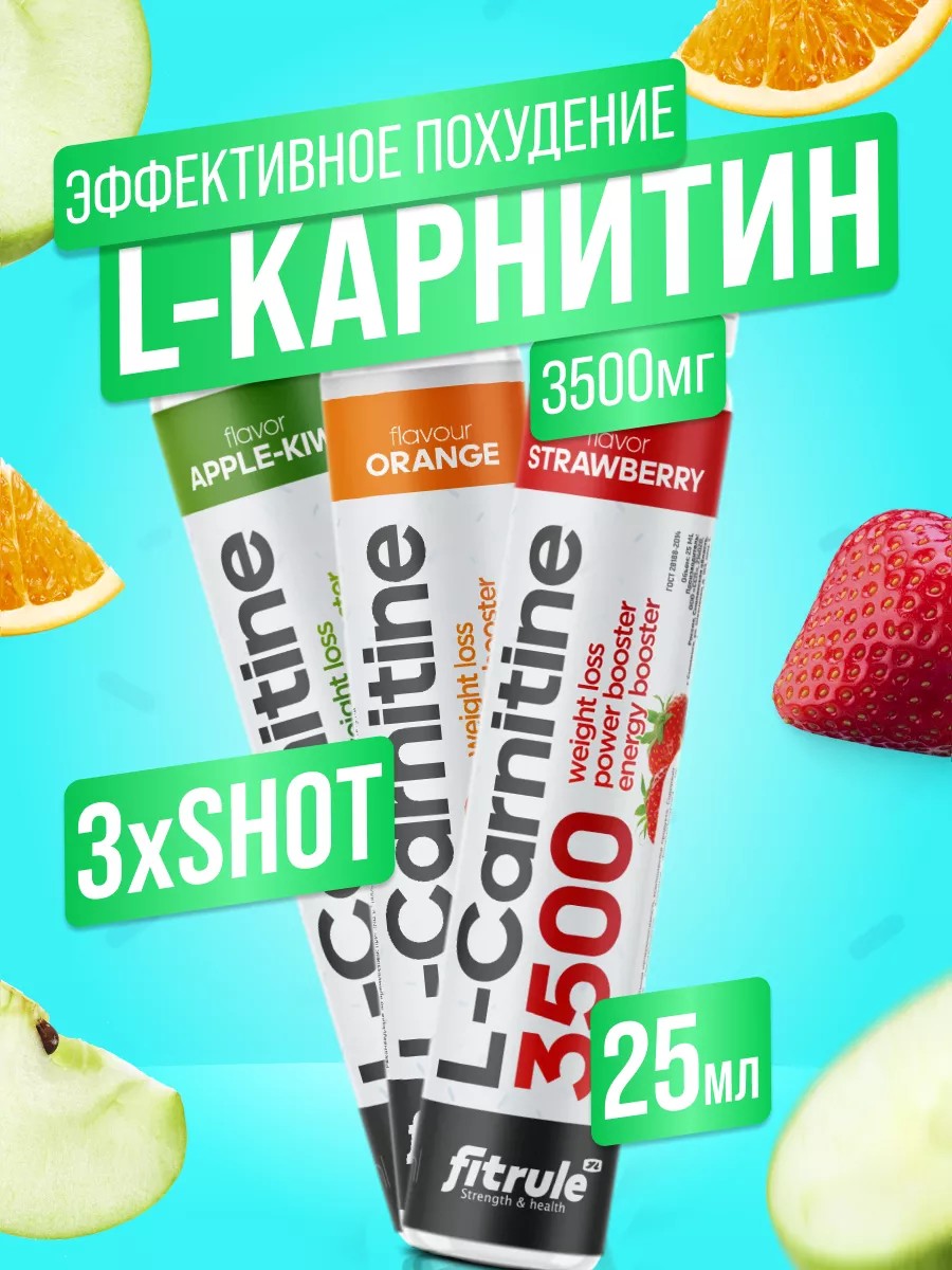 3 шт Fitrule L-Carnitine 3500mg 25ml – это концентрат л-карнитина в комплексе с тартратом (винной кислотой). Л-карнитин выполняет транспортную функцию, то есть переносит жирные кислоты в митохондрии в мышечной (и не только) клетке, где они превращаются в энергию. Таким образом, л-карнитин стимулирует процесс жиросжигания.