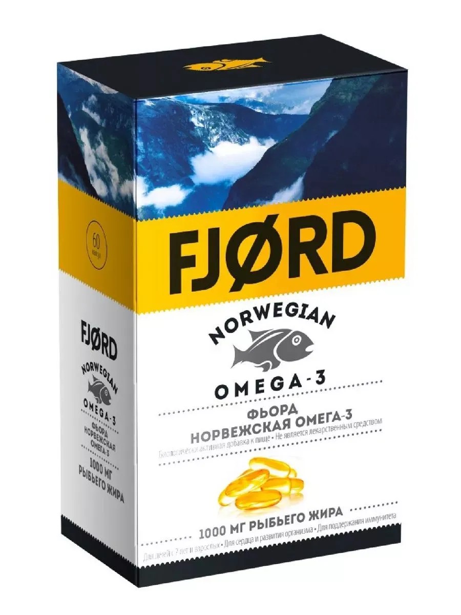 FJORD Norwegian Omega-3 / FJORD Norwegian Omega-3 - soft gelatin capsules in a blister, packed in a cardboard box. Nutritional value in one capsule: fish oil 1000 mg. - Omega-3: 600 mg, including - Eicosapentaenoic acid (EPA) - 300 mg; - Docosahexaenoic acid (DHA) - 200 mg. Polyunsaturated fatty acids Omega-3 inhibit thrombus formation, ensure the maintenance of the body's immune status, normalize cerebral circulation, increasing the stability of cerebral vessels during hypoxia and a drop in blood pressure, help improve memory, and have an anti-inflammatory effect. RECOMMENDATIONS FOR USE: children from 7 years of age and adults, 1 capsule 1 time per day. Do not exceed the established recommended dose. Should not be used as a meal substitute. Do not use after the expiration date. Dispose of as food waste after the expiration date.