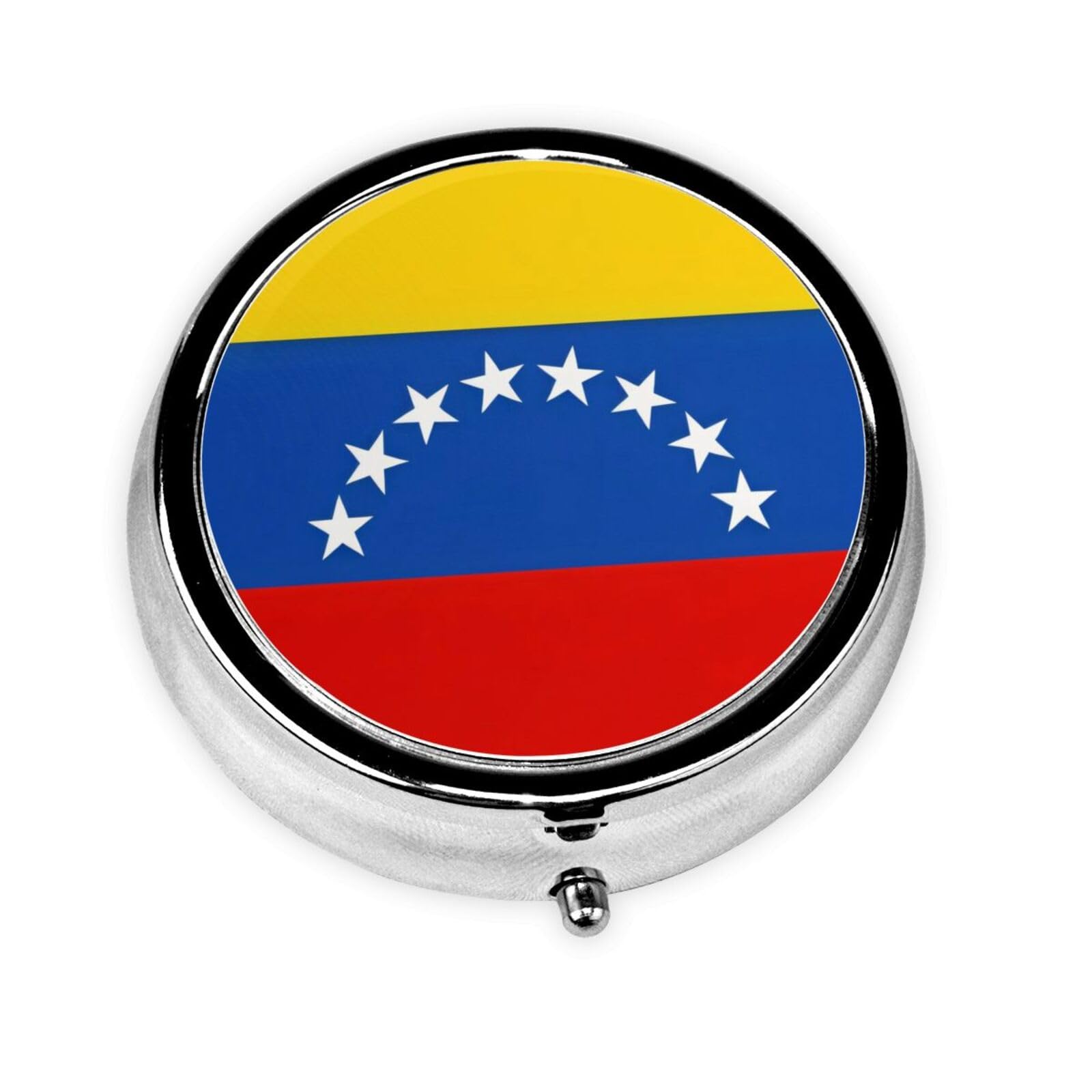 Flag of Venezuela round mini pill box is made of metal iron plating material, environmentally friendly metal, mini and portable, perfect for carrying in your pocket or purse, ideal for your travels. The button design is easy to open and comes with a 3-compartment plastic insert to fit small pills. The size is 2.0x2.0x0.7 inches, lightweight and portable, a good helper for travel!