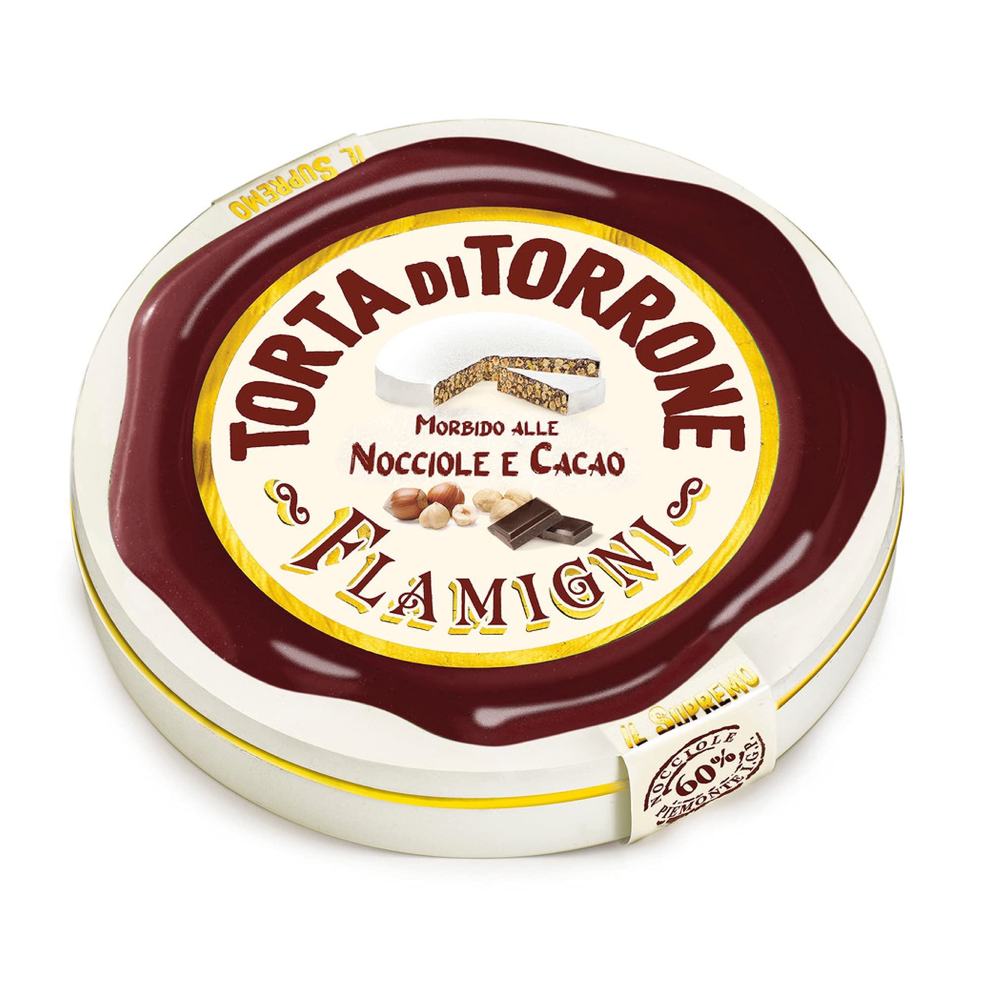CUSTOMER SERVICE - We have large storage areas and a specialized, highly competent staff to ensure the smooth operation of the company's logistics. We recommend storing the product away from heat sources and direct sunlight in its original packaging at 16-20 C. Once opened, it must be kept sealed in its original packaging. Feel free to contact us! FLAMIGNI - Since 1930, Flamigni has offered its customers carefully crafted specialty products, from the choice of ingredients to the care taken with packaging, with constantly updated recipes and packaging to satisfy the tastes and trends of the confectionery sector worldwide. Flamigni stands for a passion for quality and craftsmanship that has remained unchanged since the beginning and is renewed every day. ITALIAN QUALITY - All Flamigni products are handmade in Italy. The heart of our Panettone lies in the sourdough starter, whose strain imparts unique aromas and sweetness to the dough. Produced without the addition of other yeasts, it is exceptionally soft and highly digestible. Made with strong, elastic wheat flour, sugar, and egg yolks sourced from Italian farms, as well as high-quality French butter. NOUGAT - Nougat is an ancient dessert, a kind of time machine that makes us feel like our great-grandparents when we were children. Flamigni's Supreme Nougat is an exclusive Flamigni creation. Its distinctive feature is the inverse ratio of dried fruit to the base of sugar, honey, and egg white compared to the traditional recipe. This results in a less sweet product, easier to chew, with aromatic fruit notes. CONTENTS - At home, you will receive one box of soft Flamigni Supremo hazelnut and cocoa cakes. Ideal as a Christmas gift, to place in baskets for friends or family, or to enjoy whenever you like. It's a blend of fragrant and soft nougat with 60 Langhe IGP chocolate hazelnuts. The delicate and flavorful paste is made soft thanks to a careful and studied baking process that maintains a high level of moisture.
