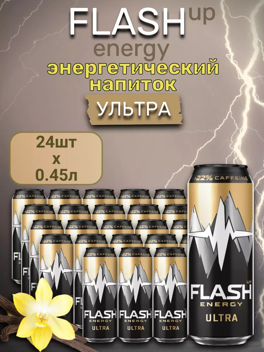 Flash Up Ultra Energy — безалкогольный энергетический напиток с усиленным энергетическим эффектом: +22% кофеина и в 2 раза больше таурина*. Яркий вкус сочетает в себе ноты ванили и барбариса. Содержит кофеин, таурин и комплекс витаминов.