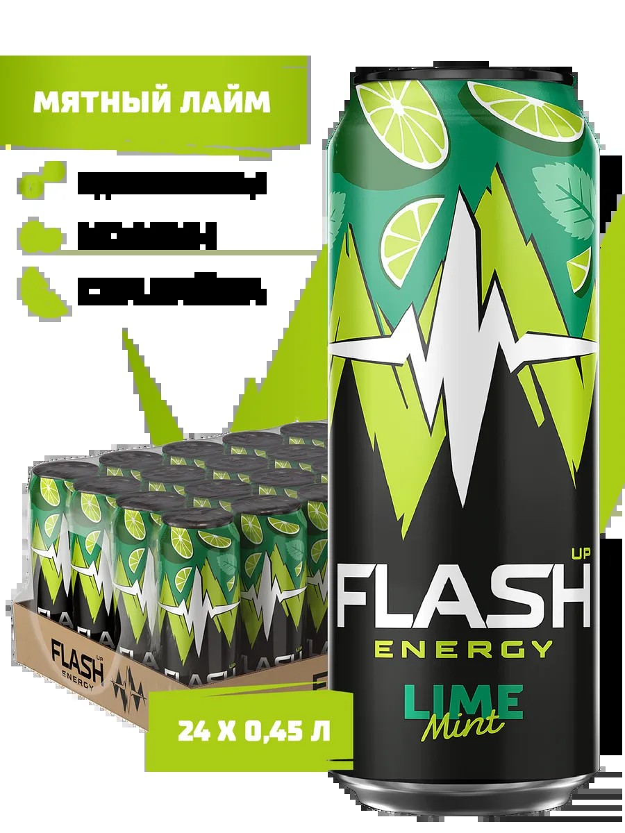 Flash Up Energy Мятный лайм — безалкогольный энергетический напиток, сочетающий в себе вкус сочного лайма и ноты освежающей мяты. Содержит сок лайма, таурин, кофеин и комплекс витаминов.