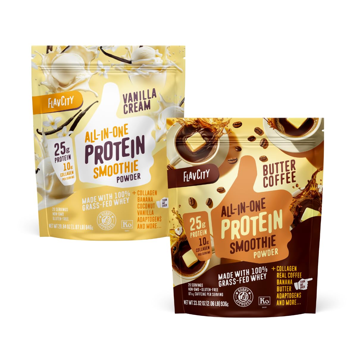 FlavCity Butter Coffee & Vanilla Smoothie Bundle - 25g Grass Fed Whey Protein Powder & 10g Collagen in Vanilla and Coffee Flavors - Real Vanilla Bean & Coconut Gluten Free (20 Servings Each)