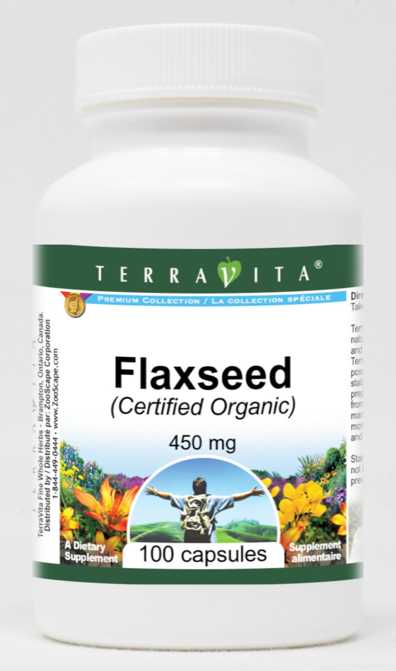 Flaxseed (Certified Organic) - 450 mg (100 capsules, ZIN: 517688) Packaged in the United States in a GMP certified facility (Good Manufacturing Practice). No fillers. Manufacturer: TerraVita Size: 100 capsules Easy-to-swallow Capsules in a sealed bottle. Ingredients: Gelatin, Water, Flaxseed - 450 mg (Certified Organic)