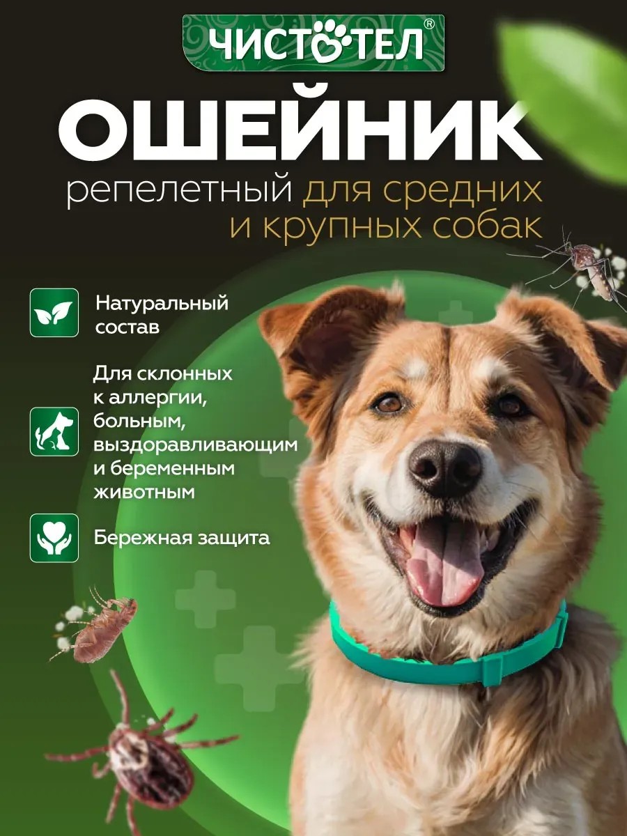 Celandine Bio Flea and Tick Collar for Dogs, 65 cm. The Celandine Bio Collar contains biorepellents that help deceive parasites' sense of smell. Essential oils repel ectoparasites and relieve irritation and itching. This collar is designed for medium-sized dogs. It is safe for pregnant and lactating females, puppies, sick and recovering dogs, and those prone to allergies. The Celandine Bio Collar for dogs provides excellent protection against ticks, fleas, lice, chewing lice, mosquitoes, flies, and horseflies for up to 90 days. Directions for use: Unwrap the flea and tick repellent and secure it loosely around your pet's neck. The collar should be worn constantly and replaced with a new one when the expiration date has passed. Active ingredients: neem oil, tea tree oil, geranium oil, and rosemary oil. Collar length: 65 cm, color: green.