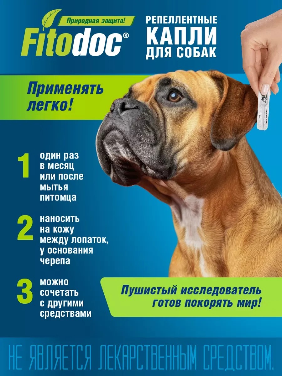 Капли на холку от блох и клещей для собак всех пород весом от 10 до 25 кг. В комплекте 1 пипетка 1 мл, которая позволяет защитить вашу собаку от эктопаразитов на срок до 4 недель. Капли Fitodoc для собак - безопасное высокоэффективное средство в капсулах для бережной защиты, наш репеллент подойдет для защиты от власоедов, блох, комаров, мошек, чесоточных и иксодовых клещей. Эфирные масла Ним, хризантемы и эвкалипта отпугивают паразитов, маскируют запах шерсти животного, снимают зуд и раздражение, вызванные укусами насекомых. Диметикон – природный репеллент, который исключает заражение животных, так как склеивает конечности блох и клещей при передвижении по шерсти животного и необратимо блокирует дыхание паразитов. Способ применения: Отломать верх пипетки и, раздвинув шерсть, нанести капли на кожу вдоль позвоночника, в недоступные для слизывания капель места - в области шеи у основания черепа или между лопатками, в дозах, указанных в таблице. Для достижения максимального эффекта, капли наносят в наибольшее количество точек. Для обработки животных менее 2 кг, капли наносят в дозе 0,05 мл (две капли) на 0,5 кг массы животного. Повторные обработки на протяжении сезона активности насекомых и клещей рекомендуется проводить по показаниям, но не чаще 1 раза в месяц или после мытья. После мытья животного следует просушить шерсть перед нанесением капель. Капли можно применять одновременно с другими инсектоакарицидными средствами с интервалом 2-3 дня. Для усиления защиты животного от эктопаразитов после применения капель рекомендуется обработать шею, туловище, конечности, живот и хвост животного репеллентным спреем FITODOC Мах. Не рекомендуется использовать для животных с повышенной чувствительностью к компонентам капель. Не подлежат обработке кормящие самки и котята моложе 4-недельного возраста. Следует принять меры для предотвращения попадания капель в рот и глаза. Не наносить капли на поврежденную кожу. Не рекомендуется мыть животное за 3 дня до и 3 дня после обработки.