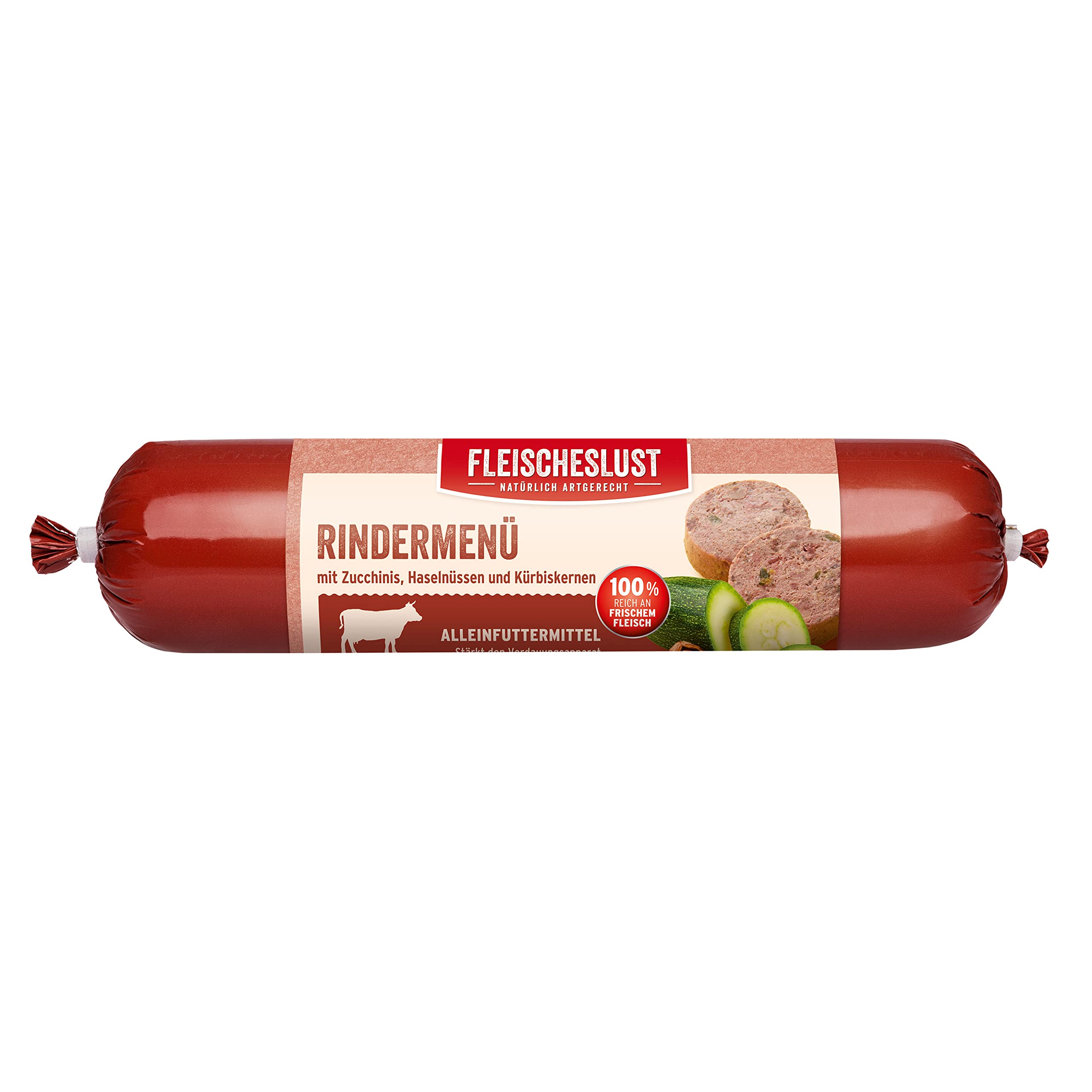 Fleischeslust Dog Sausage with Beef Menu – Natural and Species-Friendly Fleischeslust menus leave nothing to be desired for dogs: fresh, carefully tested meat as well as crispy, high-quality vegetables ensure a vital life for the dog. Short transport distances as well as regular and strict quality controls provide an irresistibly fresh and delicious taste experience – Made in Germany. With the beef menu your four-legged friend receives high-quality beef, zucchini, hazelnuts and pumpkin seeds with valuable nutrients and vitamins - 100 gluten-free and grain-free recipe. The dog food is rich in potassium, calcium, magnesium, phosphorus and protein and is easy to digest. Free from artificial preservatives, flavors, flavor enhancers and sugar, the wet dog food is gently processed at low temperatures and under little pressure and is ideal as a complete food. Fleischeslust is pure natural: our range consists of 100 natural, fresh and carefully selected raw materials of the highest quality - only the best for our fur noses. Product benefits at a glance: Complete dog food, made in Germany. Premium quality 100 natural ingredients. High content of meat, vegetables and carbohydrates. Gluten- and grain-free formula Cut resistant and well finished. Strictly controlled and resource-friendly packaging Variety: Beef menu with beef, zucchini, hazelnuts and pumpkin seeds Package Content: 1 x 800g INGREDIENTS Beef, zucchini, hazelnuts, pumpkin seeds DIRECTIONS FOR USE The actual need depends on breed, age and activity. Feed at room temperature. When feeding snacks, the amount of food should be reduced accordingly. Vital Delicious – With all the essential components of a vital dog diet, Fleischeslust wet dog food is an optimal complete food. Premium quality – Strict quality controls, gentle processing, and resource-saving packaging make the wet dog food irresistibly delicious. Tasty ingredients – When you cut into the cut-resistant sausage, you can see exactly what's inside: the finest ingredients and juicy pieces of meat. Beef menu – Fresh beef, zucchini, and hazelnuts provide valuable nutrients and make the wet food easily digestible. 100 gluten- and grain-free recipe. Natural and tailored to the needs of animals – Fleischeslust stands for premium pet food with 100 natural and fresh ingredients, made in Germany. Fleischeslust Saucisse pour chien au menu de bœuf – Naturel et adapté aux espèces Les menus Fleischeslust ne laissent rien à désirer pour les chiens : la viande fraîche et soigneusement testée ainsi que les légumes croustillants de qualité supérieure assurent une vie vitale du chien. Les courtes distances de transport ainsi que les contrôles de qualité réguliers et stricts offrent une expérience gustative irrésistiblement fraîche et délicieuse – Fabriqué en Allemagne. Avec le menu de bœuf, votre ami à quatre pattes reçoit du bœuf, des courgettes, des noisettes et des graines de citrouille de qualité supérieure avec des nutriments et des vitamines précieux - Recette 100 sans gluten et sans céréales. La nourriture pour chien est riche en potassium, calcium, magnésium, phosphore et protéines et est facile à digérer. Sans conservateurs artificiels, arômes, exhausteurs de goût et sucre, la nourriture humide pour chiens est traitée en douceur à basse température et sous peu de pression et est idéale comme aliment complet. Fleischeslust est naturel pur : notre gamme est composée de matières premières 100 naturelles, fraîches et soigneusement sélectionnées de qualité supérieure - seulement le meilleur pour nos nez en fourrure. Les avantages du produit en un clin d'œil : Aliment complet pour chien, fabriqué en Allemagne. Ingrédients 100 naturels de qualité supérieure. Haute teneur en viande, légumes et glucides. Formule sans gluten et sans céréales Résistant aux coupures et finition soignée. Emballage strictement contrôlé et respectueux des ressources Variété: Menu de boeuf avec bœuf, courgettes, noisettes et graines de citrouille Contenu de l'emballage : 1 x 800 g INGRÉDIENTS Bœuf, courgettes, noisettes, graines de citrouille MODE D'EMPLOI Le besoin réel dépend de la race, de l'âge et de l'activité. Nourrir à température ambiante. Lors de l'alimentation des collations, la quantité d'aliments doit être réduite en conséquence. Vital délicieux – Avec tous les composants essentiels d'une alimentation vitale pour chien, la nourriture humide pour chien Fleischeslust est un aliment complet optimal. Qualité supérieure - Des contrôles de qualité stricts, une finition douce et des emballages respectueux des ressources rendent la nourriture humide pour chien irrésistiblement délicieuse. Ingrédients savoureux – Lorsque vous coupez la saucisse résistante aux coupures, vous pouvez voir exactement ce qu'il contient: meilleurs ingrédients et morceaux de viande juteux. Menu de boeuf - Le bœuf frais, les courgettes et les noisettes fournissent des nutriments précieux et rendent les aliments humides bien digestibles - Recette 100 sans gluten et sans céréales. Naturel et adapté aux besoins des animaux – Fleischeslust est synonyme d'aliments pour animaux de compagnie de qualité supérieure avec des ingrédients 100 naturels et frais, fabriqué en Allemagne.