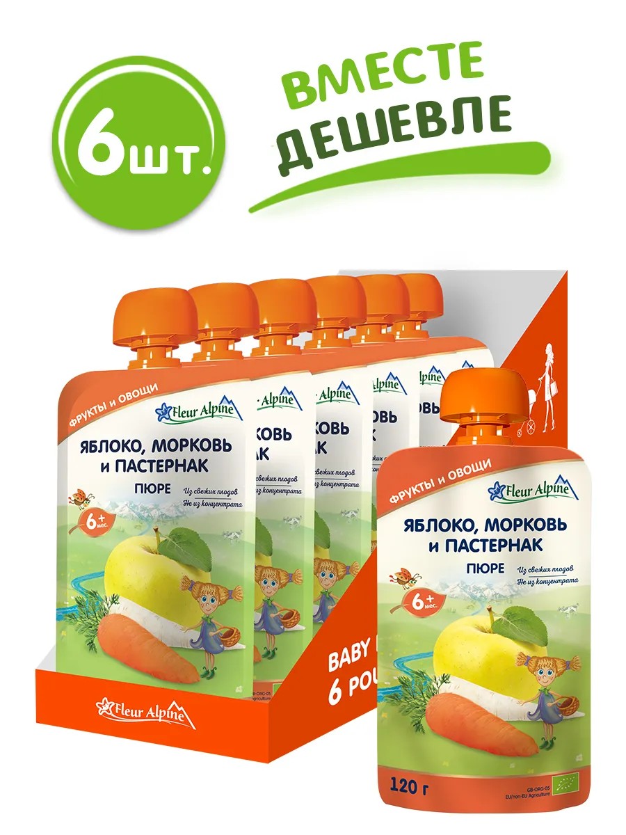 Пюре детское ЯБЛОКО, МОРКОВЬ И ПАСТЕРНАК, с 6 мес, 6 шт по 120 г
