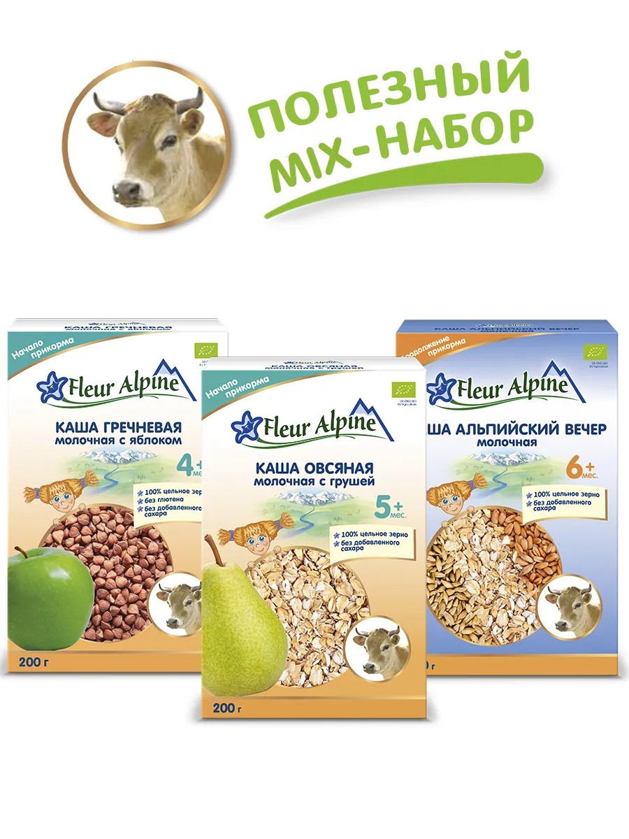 Набор детских молочных каш Fleur Alpine АЛЬПИЙСКИЙ ВЕЧЕР + ГРЕЧНЕВАЯ С ЯБЛОКОМ + ОВСЯНАЯ С ГРУШЕЙ :