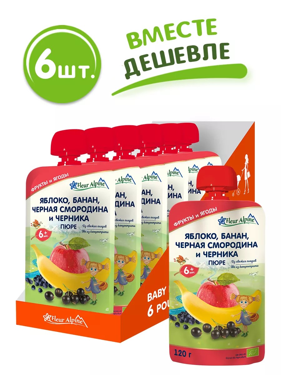 Пюре Fleur Alpine ЯБЛОКО, БАНАН, ЧЕРНАЯ СМОРОДИНА И ЧЕРНИКА оценят не только малыши, но и дети постарше.Производится из свежих фруктов и ягод - не из концентрата.Других компонентов, включая воду, в составе пюре нет.Органический продукт, произведен в Шотландии и сертифицирован в соответствии с Регламентами ЕС № 834/2007 и № 889/2008 об органическом сельском хозяйстве.Пюре отлично подходит для продолжения знакомства малыша с новыми фруктово-ягодными вкусами. Сочетание банана, благородной кислинки черной смородины и черники с нотками яблока создают невероятный вкус, в котором ощущаются все ингредиенты. Яркий фруктовый аромат и в меру густая консистенция вызывают аппетит.ВАЖНО: если упаковка вздута, не используйте продукт. При вводе новых продуктов в рацион ребенка требуется консультация педиатра.Закрытую упаковку хранить в сухом месте при температуре от 0 С до +25 С и относительной влажности не более 75%. После вскрытия хранить с закрытой крышкой в холодильнике 24 часа.