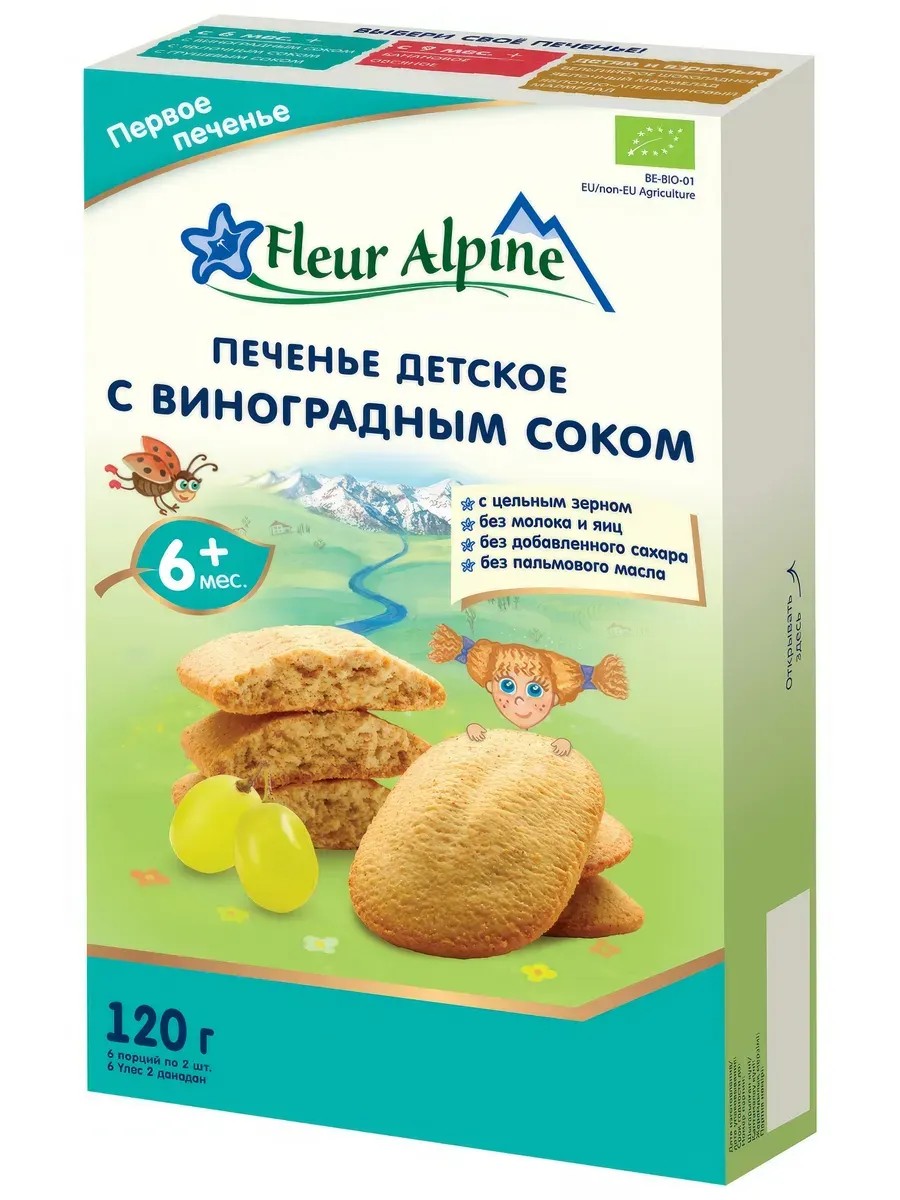 Печенье детское Fleur Alpine с виноградным соком, 120г представляет собой мягкое лакомство без содержания сахара. Оно может понравиться всем, кто любит употреблять слегка сладковатые продукты. В составе отсутствуют молоко и яйца. Угощение выпекается с применением масла подсолнечника и цельнозерновой муки. Его можно употреблять в качестве перекуса или использовать как основной компонент для приготовления каши. Печенье отличается насыщенным, ярким вкусом и приятным ароматом. Послевкусие длительное. Десерт хорошо сочетается с молоком, соком или чаем. Его можно давать детям с 6 месяцев. Лакомство выпускается в плотных упаковках с привлекательным дизайном по две штуки в каждой, что дает возможность без труда брать их всюду с собой. Оно не крошится, а компактные размеры очень удобны для ручки малыша.