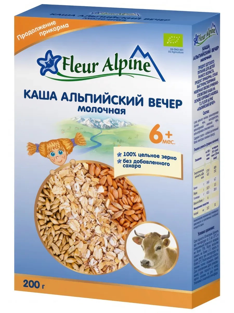 Каша молочная Fleur Alpine Альпийский вечер для детей старше 6 месяцев. Цельное зерно, из которого изготовлена каша, содержит натуральные витамины, минералы и пищевые волокна. Бережная технология производства позволяет сохранить ценные нутриенты. Цельное молоко от коров, находящихся в свободном выпасе в Баварских Альпах, придает каше натуральную сладость, приятный молочный вкус и аромат, способствует длительному насыщению. Во вкусе каши гармонично сочетаются все входящие в ее состав злаки. Мультизлаковая каша идеально подходит для продолжения прикорма. Разводится легко, быстро и без комочков. Нежная, воздушная консистенция готовой каши в виде сугробиков напоминает снег, который ложится на поверхность небольшими пышными неровностями.