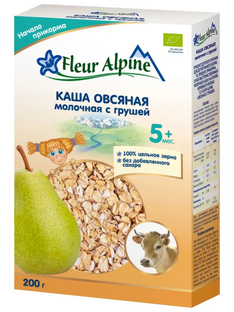 Fleur Alpine milk porridge with oatmeal and pear for children over 5 months. The whole grain from which this porridge is made contains natural vitamins, minerals, and dietary fiber. A gentle production process preserves valuable nutrients. Whole milk from free-range cows in the Bavarian Alps imparts a natural sweetness, a pleasant milky taste, and aroma, promoting long-lasting satiety. The fruity aftertaste of ripe pear makes this porridge especially appetizing. The soft, airy texture of the finished porridge resembles snow, which settles on the surface in small, fluffy undulations.
