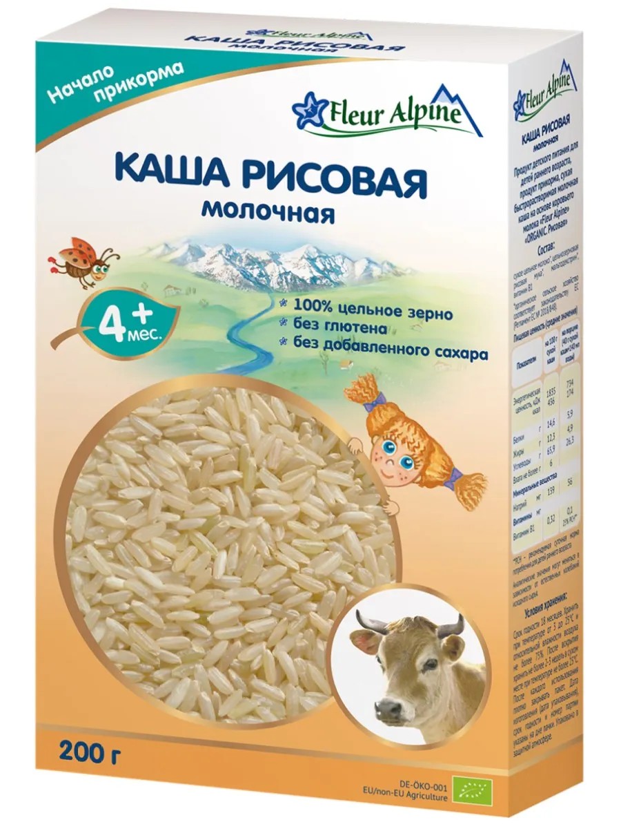 Каша молочная Fleur Alpine Рисовая для детей старше 4 месяцев. Без глютена. Без добавленного сахара. Изготовлена из высококачественного цельного зерна, предназначенного для питания детей. Разводится легко, быстро и без комочков.