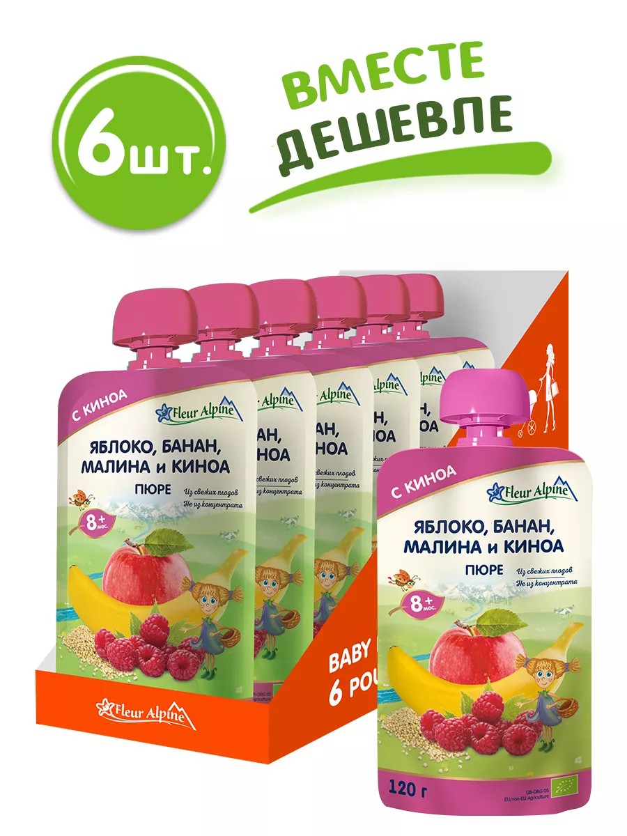 Fleur Alpine Apple, Banana, Raspberry, and Quinoa Puree will be appreciated not only by babies but also by older children. Made from fresh fruit, not from concentrate. No added water, salt, sugar, or starch. No preservatives, flavors, or colors. Non-GMO. Organic, produced in Scotland and certified in accordance with EU Regulations No. 834/2007 and No. 889/2008 on organic farming. The bright fruity aroma and optimal, moderately thick consistency whet the appetite at first sight. The combination of tender banana, the noble acidity of raspberry, and ripe apple create an incredible puree taste. Quinoa makes it more filling. IMPORTANT: If the packaging is bulging, do not use the product. When introducing new foods into a child's diet, consult a pediatrician. Store the unopened package in a dry place at a temperature of 0°C to +25°C and a relative humidity of no more than 75%. After opening, store in the refrigerator with the lid closed for no more than 24 hours.